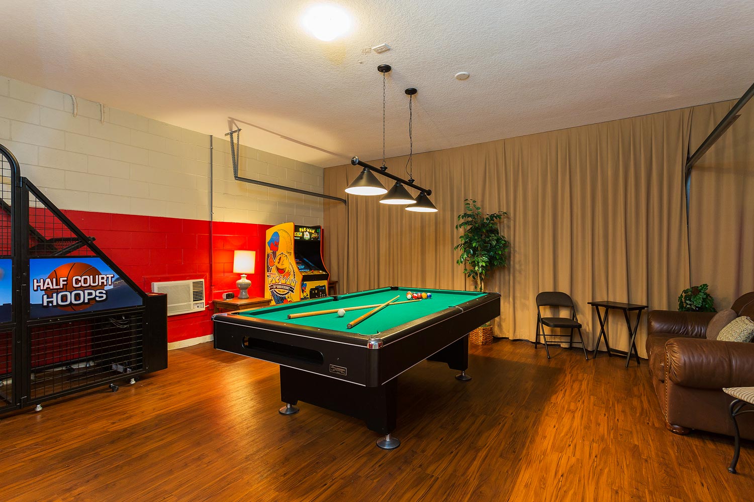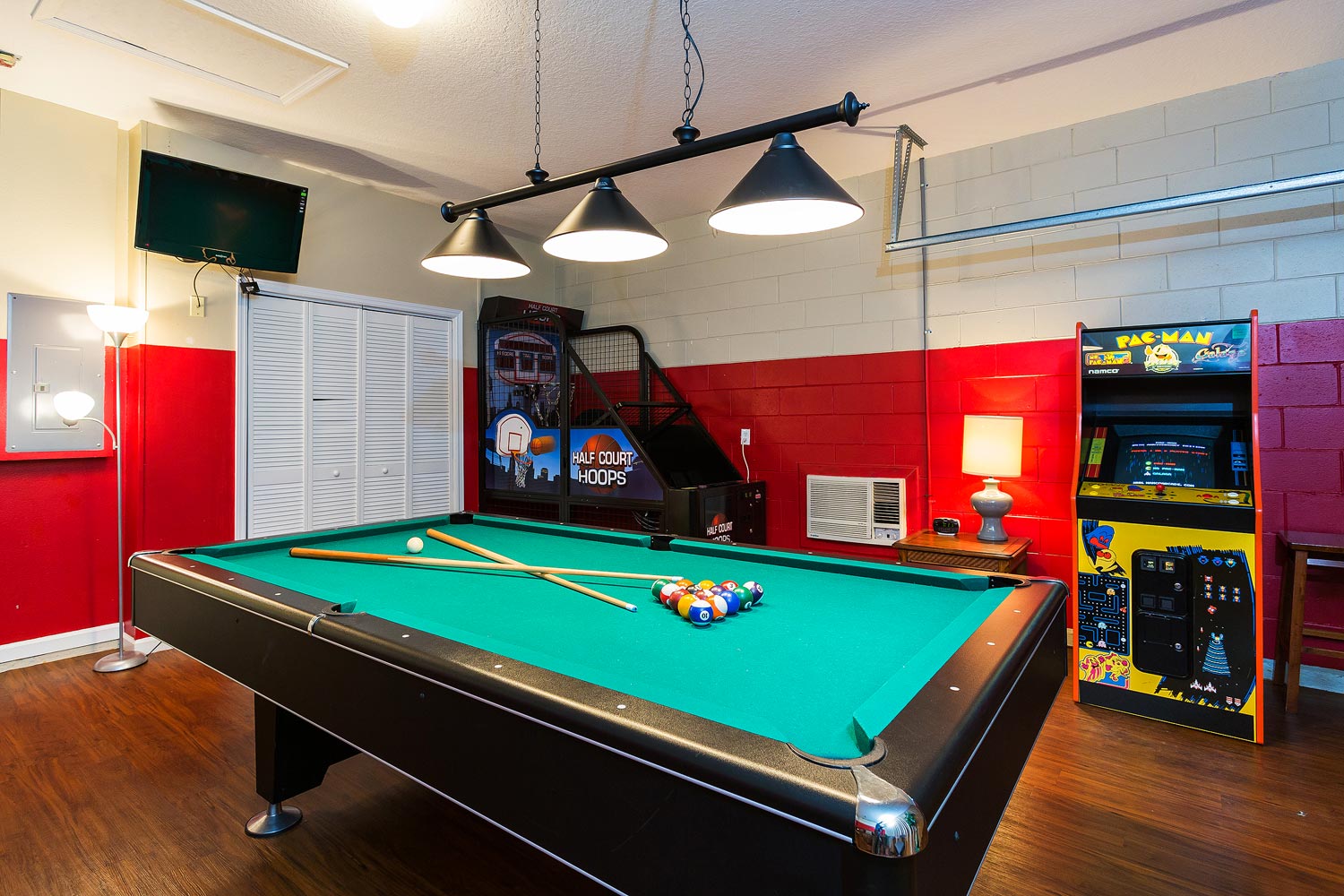 This inviting 6-bedroom, 5-bathroom vacation home features 3 masters, a private pool and spa, a fully equipped eat-in kitchen, 32" LCD TV/DVD combos in every bedroom and a living area featuring a 51" plasma TV, DVD player and surround sound/stereo system. There’s also a game room with pool table, arcade machine and 39" LCD TV plus a computer with complimentary high-speed and Wi-Fi Internet access in the main master, a large back yard, Wii and more!
