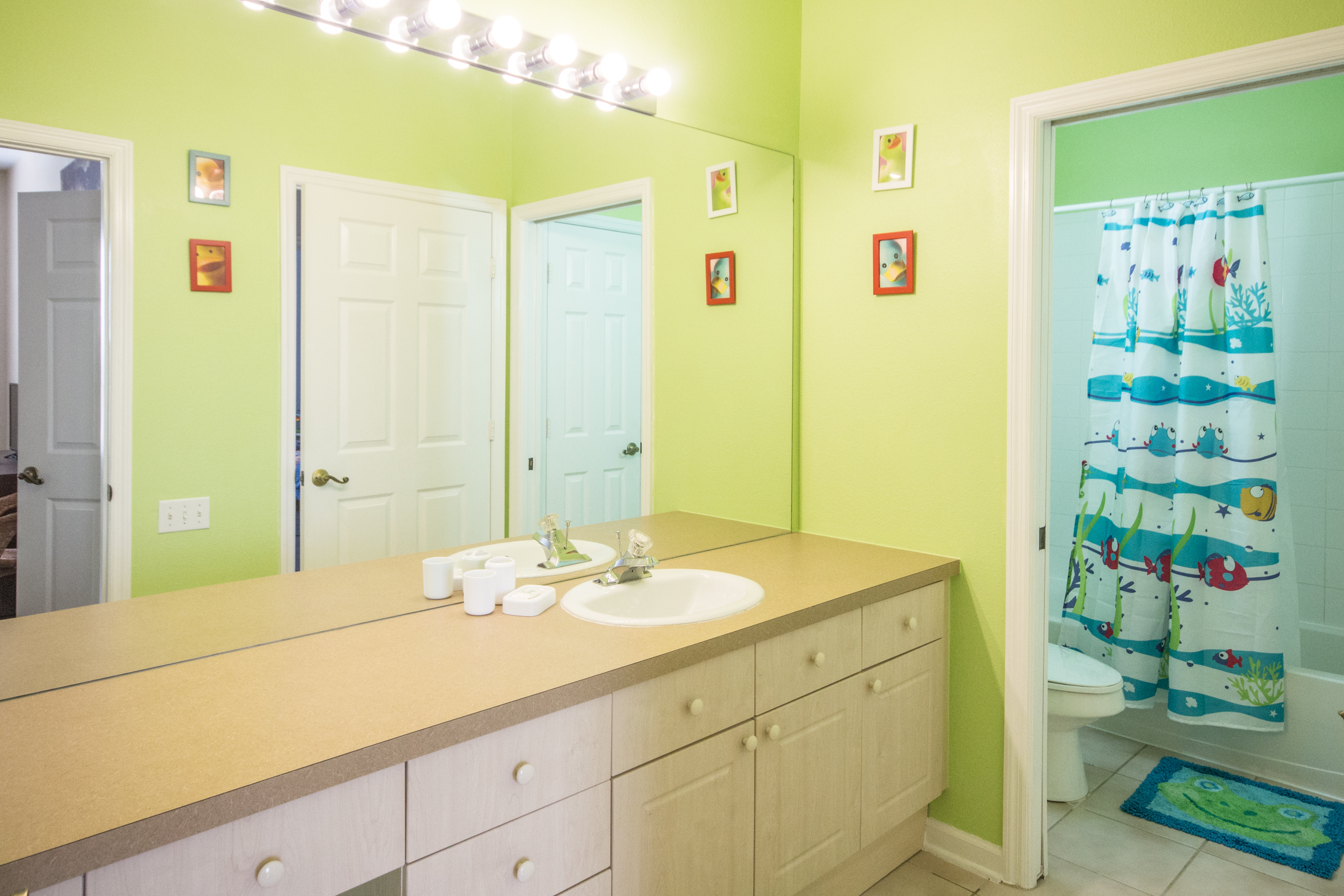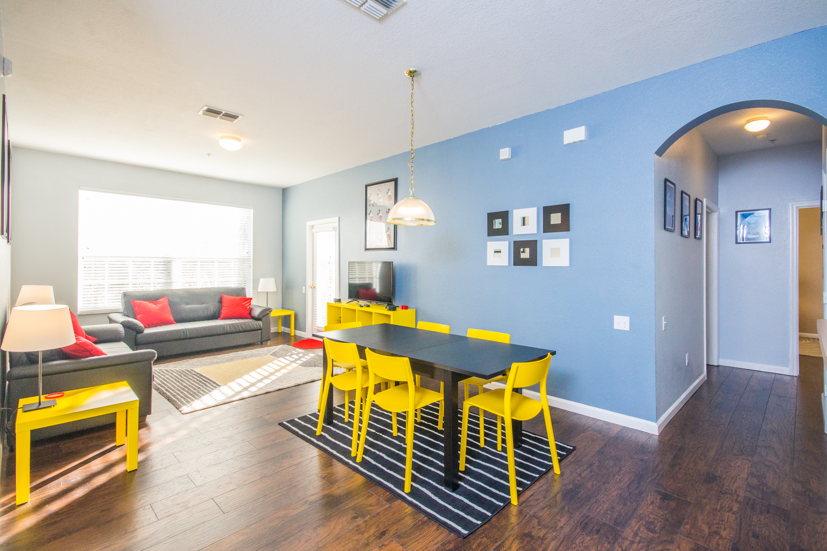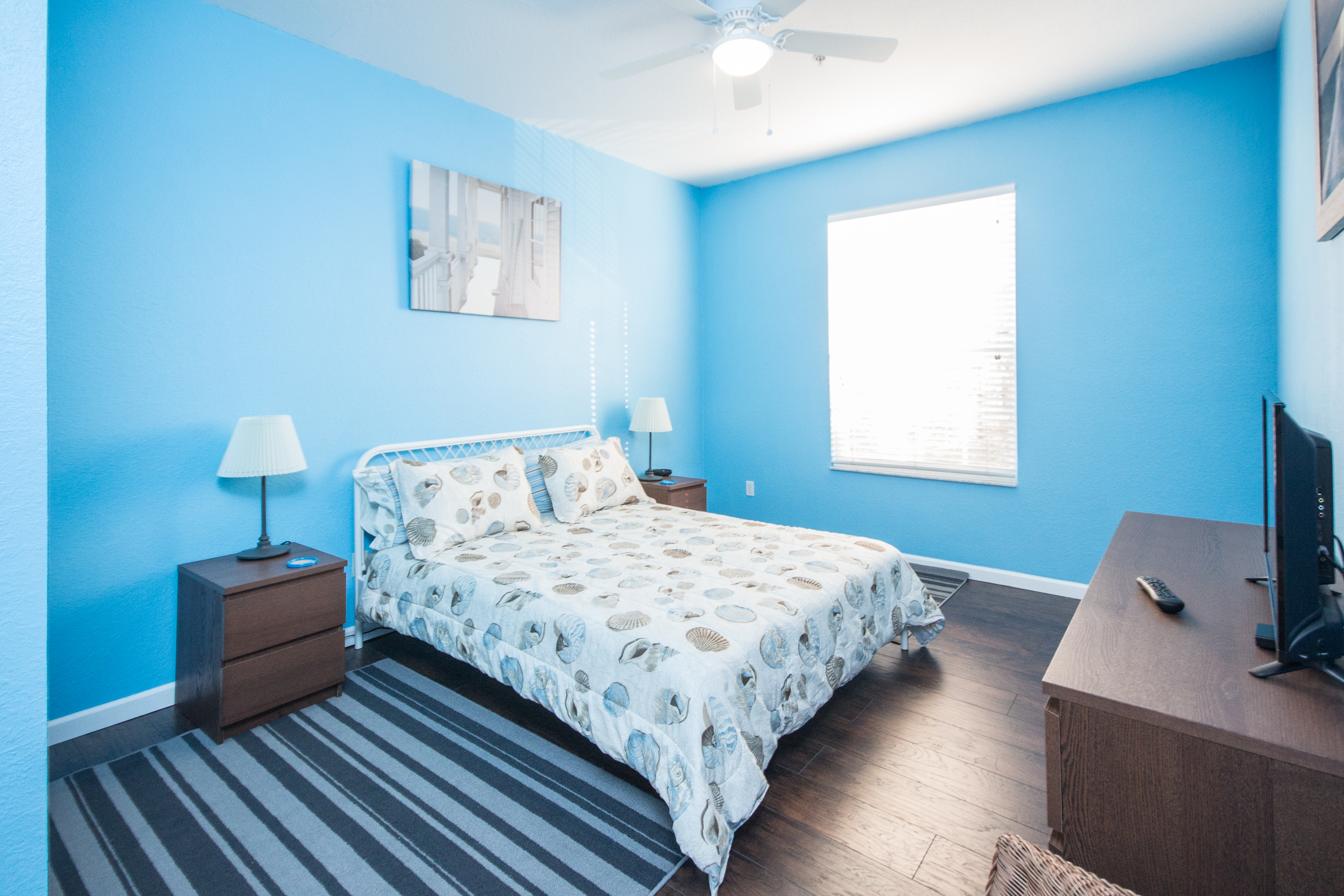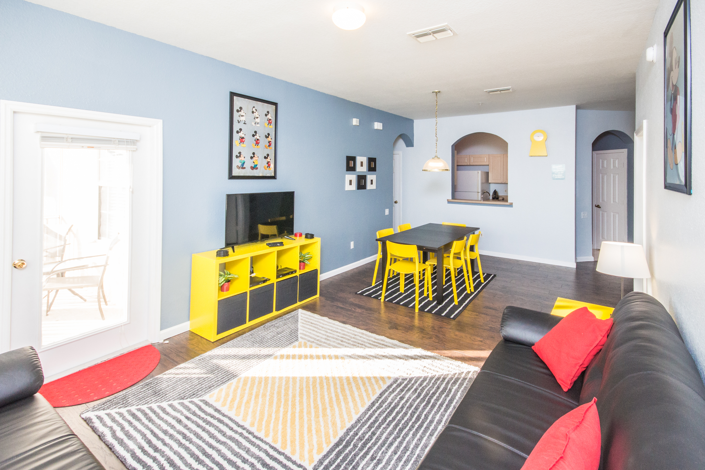 Psst, you have to check this condo. It’s different from the other condos around. If you’re a couple or small family who likes the modern style, you’re going to love this condo. When you first enter the condo, you’ll pass a simple, galley kitchen on your left. It has tiled flooring, modern appliances, and comes fully equipped to handle any recipe that you can throw at it. After you leave the kitchen, the floors change to wood, the walls change to blue, and the style of the decorations turns to modern. Want to sit down with everyone and enjoy a meal? There’s a dining room suite with a long table and 6 metal yellow seats. Just past the dining room is the large, spacious living room. Here, there are two black leather sofas with red accent cushions, yellow side tables, a patio door that leads to the covered balcony, and the all-important large flat screen TV. The living room is the place to hang out and watch some TV after a long day out at the parks. Need to figure out who is sleeping where? There are 3 bedrooms. The first bedroom, the master bedroom, has a queen-size bed, TV, and small en-suite bathroom. Bedroom two also has a queen size bed, and bedroom 3, with its Disney Cars theme, has two single beds, making this room perfect for younger kids.
