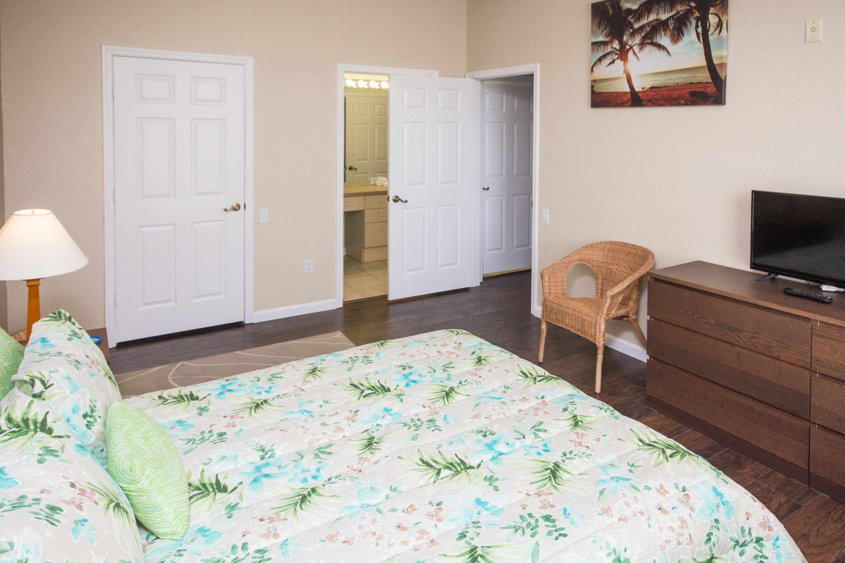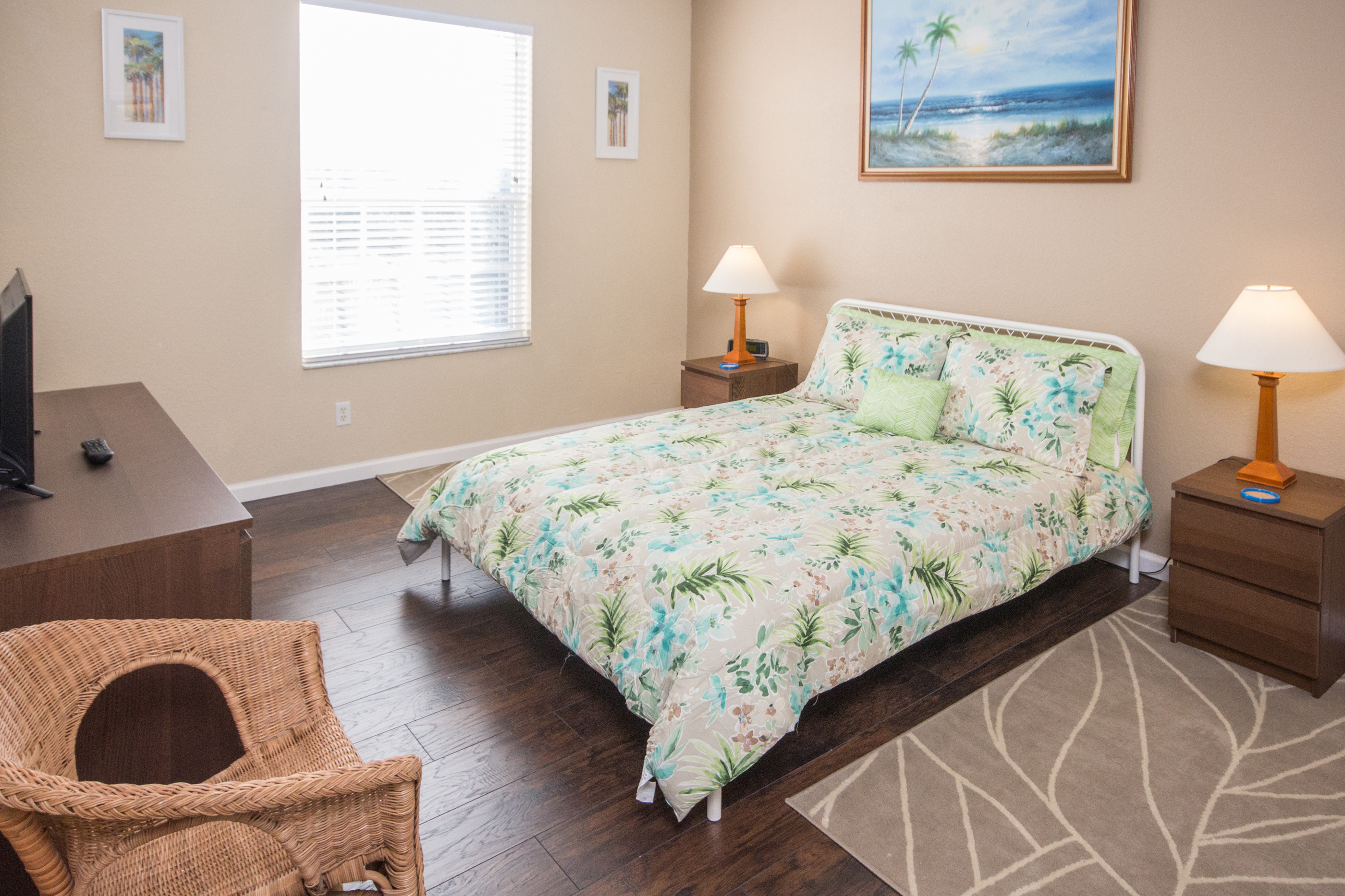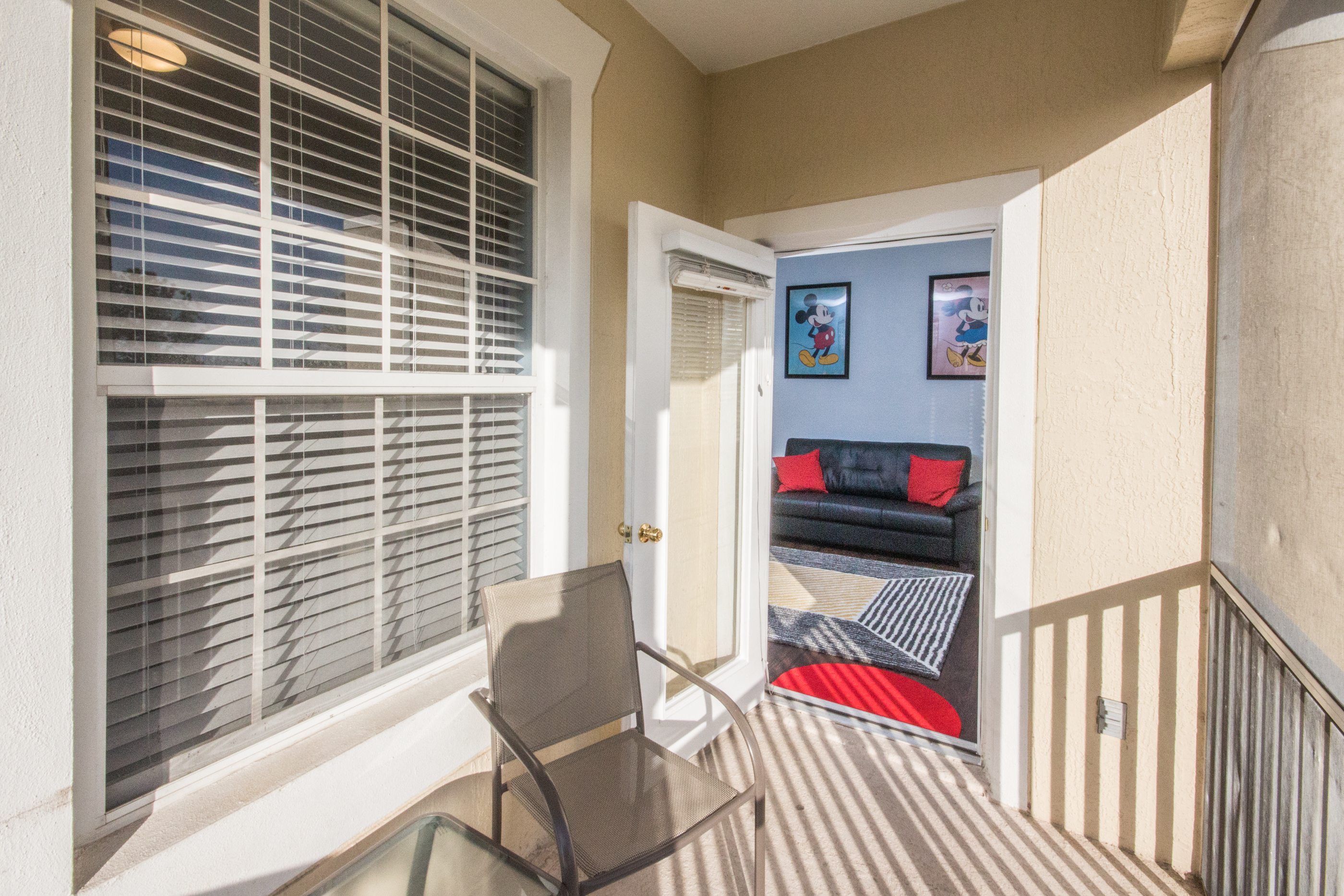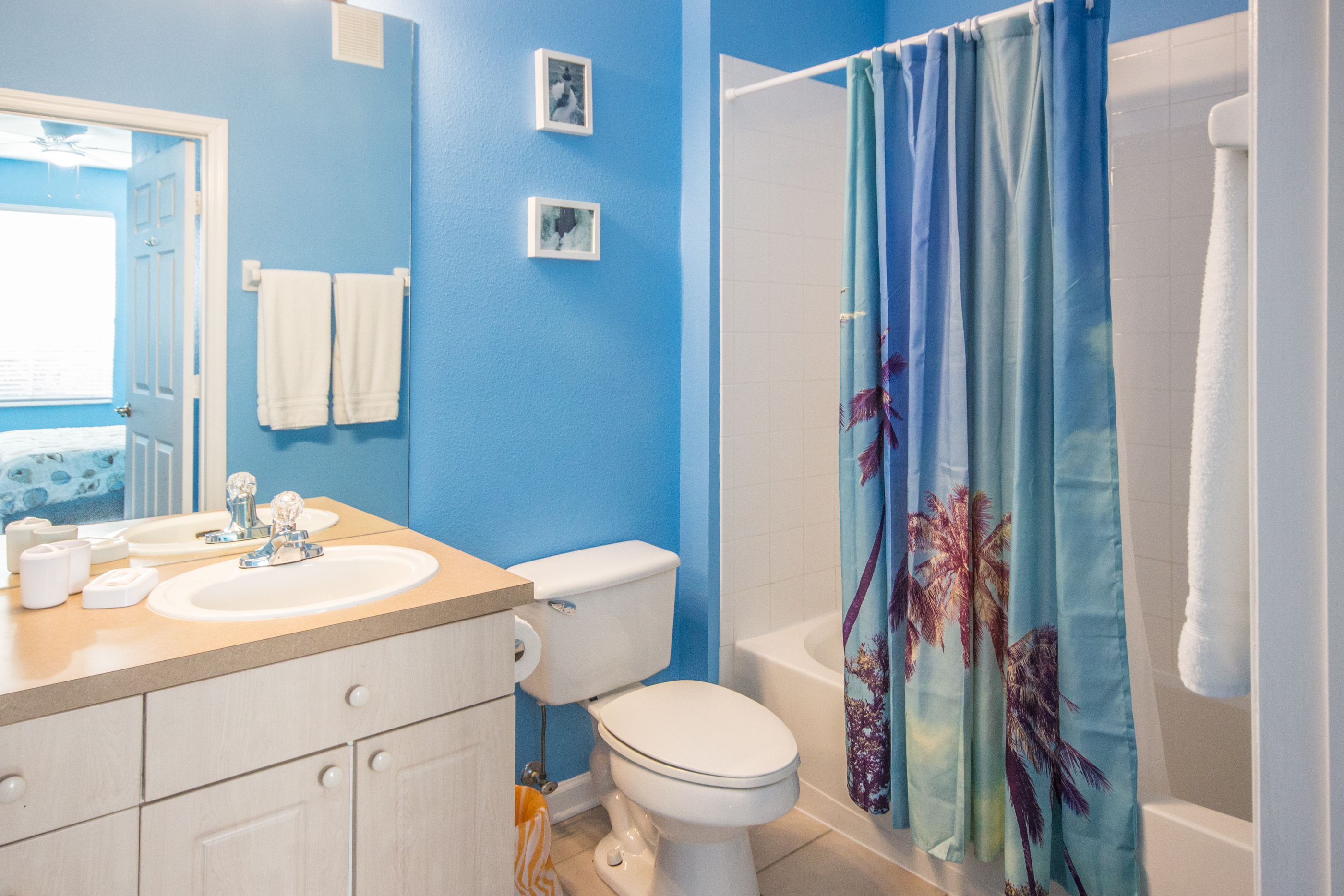 Psst, you have to check this condo. It’s different from the other condos around. If you’re a couple or small family who likes the modern style, you’re going to love this condo. When you first enter the condo, you’ll pass a simple, galley kitchen on your left. It has tiled flooring, modern appliances, and comes fully equipped to handle any recipe that you can throw at it. After you leave the kitchen, the floors change to wood, the walls change to blue, and the style of the decorations turns to modern. Want to sit down with everyone and enjoy a meal? There’s a dining room suite with a long table and 6 metal yellow seats. Just past the dining room is the large, spacious living room. Here, there are two black leather sofas with red accent cushions, yellow side tables, a patio door that leads to the covered balcony, and the all-important large flat screen TV. The living room is the place to hang out and watch some TV after a long day out at the parks. Need to figure out who is sleeping where? There are 3 bedrooms. The first bedroom, the master bedroom, has a queen-size bed, TV, and small en-suite bathroom. Bedroom two also has a queen size bed, and bedroom 3, with its Disney Cars theme, has two single beds, making this room perfect for younger kids.