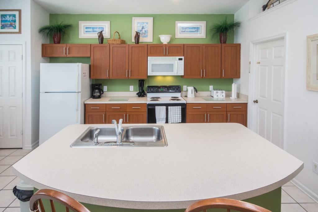 Fully equipped kitchen, includes all pots and pans, cooking utensils, plates, bowls, glasses, silverware, etc. You also have your own full size washer and dryer, which definitely comes in handy if you are staying for an extended length of time. With all the comforts of home, you are sure to have the perfect family getaway.