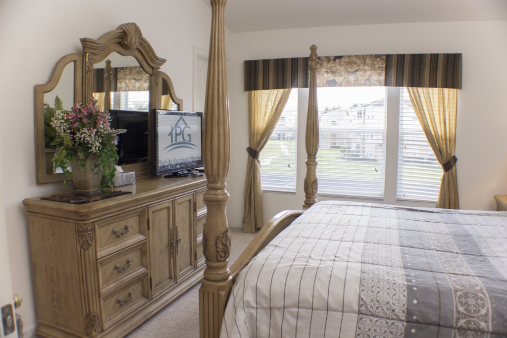 As you drive up to this gorgeous vacation villa in Windsor Palms, you’ll be taken aback by its well maintained appearance, the tidy lush gardens and its 3-park drive. Everything from its grand entrance to its spectacular scenery is a tasteful fusion of modern and ornate. As soon as you enter through the front parlor, you’ll feel right at home and you’ll also get a sense of the Mediterranean influences with the tiled floors and marble staircase. This stunning pool home has a total of 3 large bedrooms and 3 bathrooms and can comfortably sleep 8 people. There hasn’t been one detail that has been left out and if you do happen to have extra guests there is a pull-out sofa bed. The master bedroom with a 4-pillar king size bed has been tastefully designed and it also has a spacious en-suite and walk-in wardrobe. Guests can relax on the comfortable high quality king size bed and watch their large flat screen TV at the same time. The other two bedrooms are twin bedrooms, which also have their own flat screen TVs and cable TV. This Florida vacation home is perfect for the average sized family looking to get away and have a luxurious break, and the kids will feel right at home with the Disney inspired bedroom.