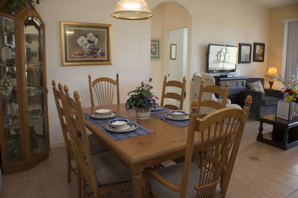 Outside the home at the back of the home on the pool deck why not enjoy lounging around your own private swimming pool with Jacuzzi after a busy day at the theme parks or sightseeing. When the sun gets a little too warm you can “hang out” under the large covered lanai with ceiling lights and enjoy the Florida weather. On the pool deck you will find upgraded furniture consisting of a table, 4 loungers and 6 chairs. There is also a pool safety net for those families with young children and a pool blanket with an electric heatable pool.