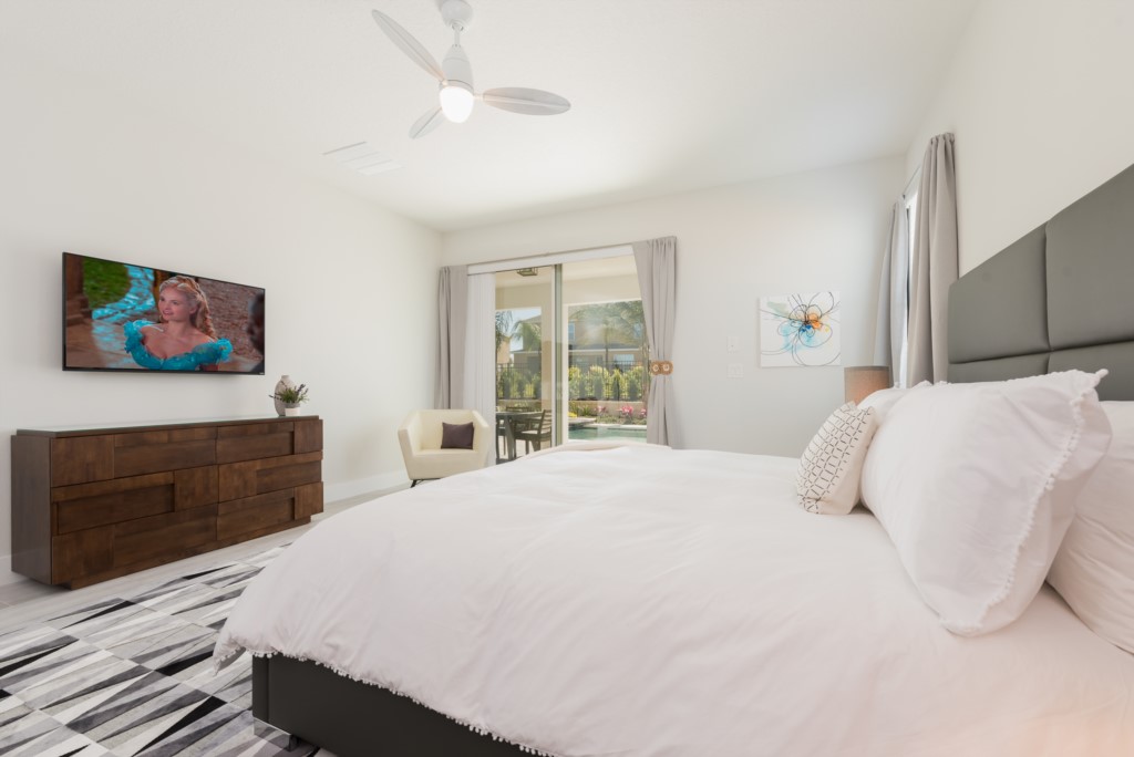 King sized bedroom with pool deck access - En suite bathroom (Bath, shower, twin vanities)