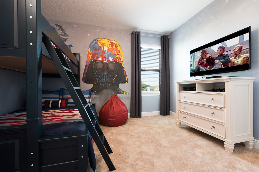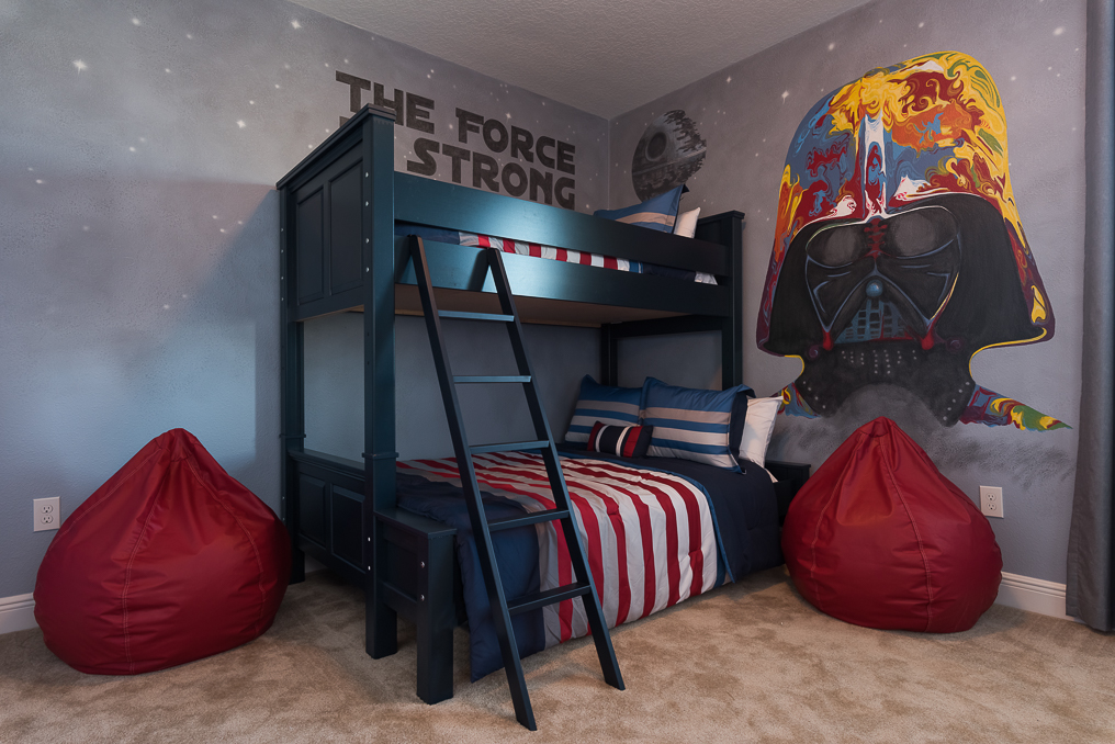 Also to the rear of the home, a Star Wars themed bedroom includes a Twin/Full bunk bed and shares access to a family bathroom with;