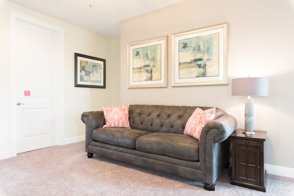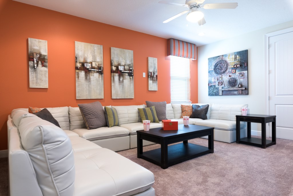 An upper floor media area with large sectional sofa, and TV