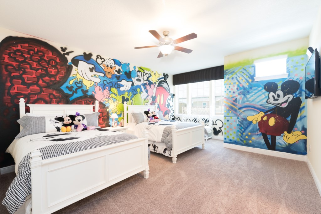 A Mickey themed room with 2x Full beds with PS4 games console - En suite (shower)