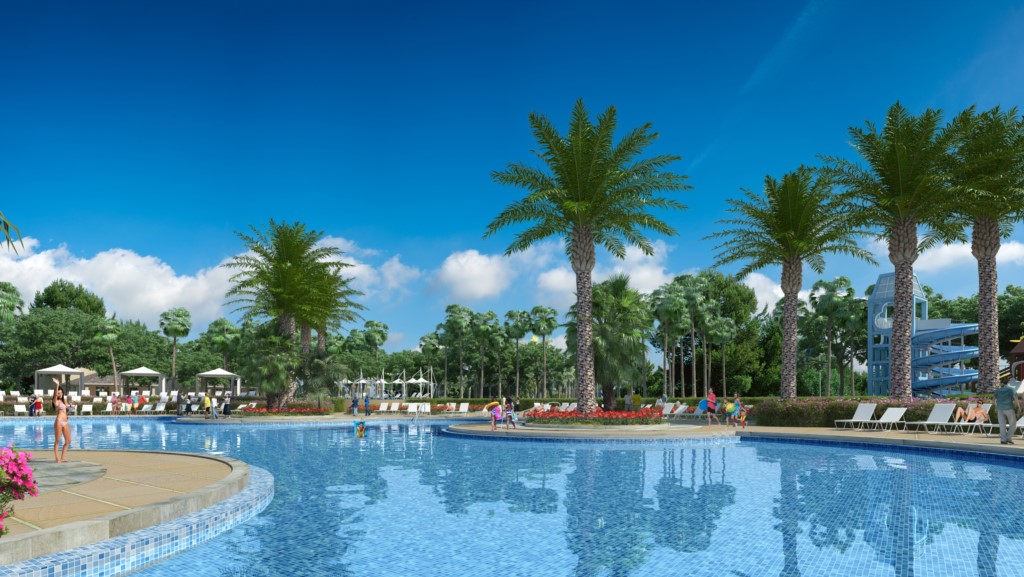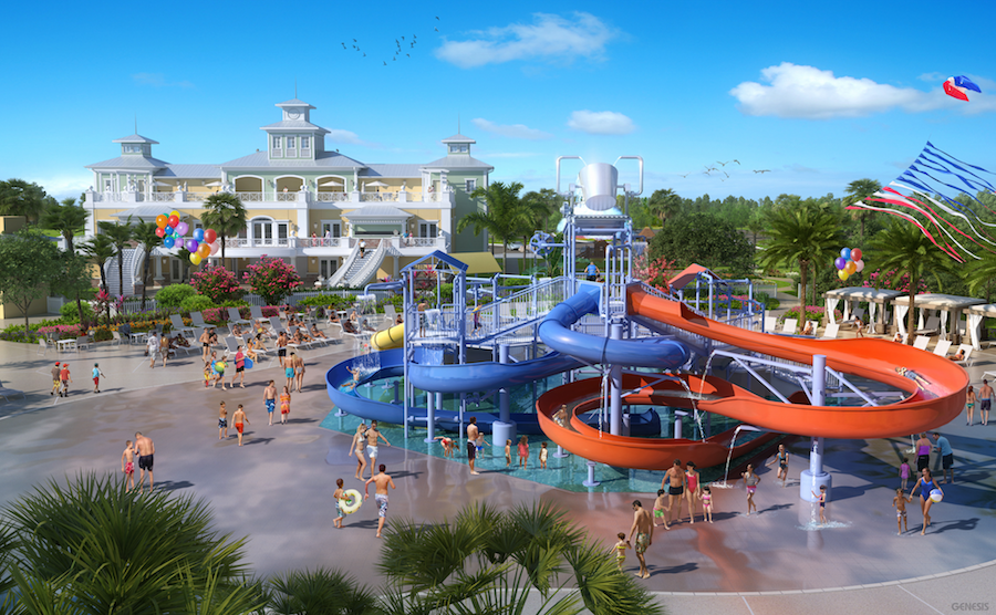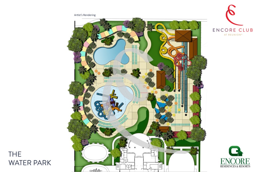 The Encore Club at Reunion will include a clubhouse, restaurants, water park, splash play area and drop slides for guests to enjoy from March 2016.