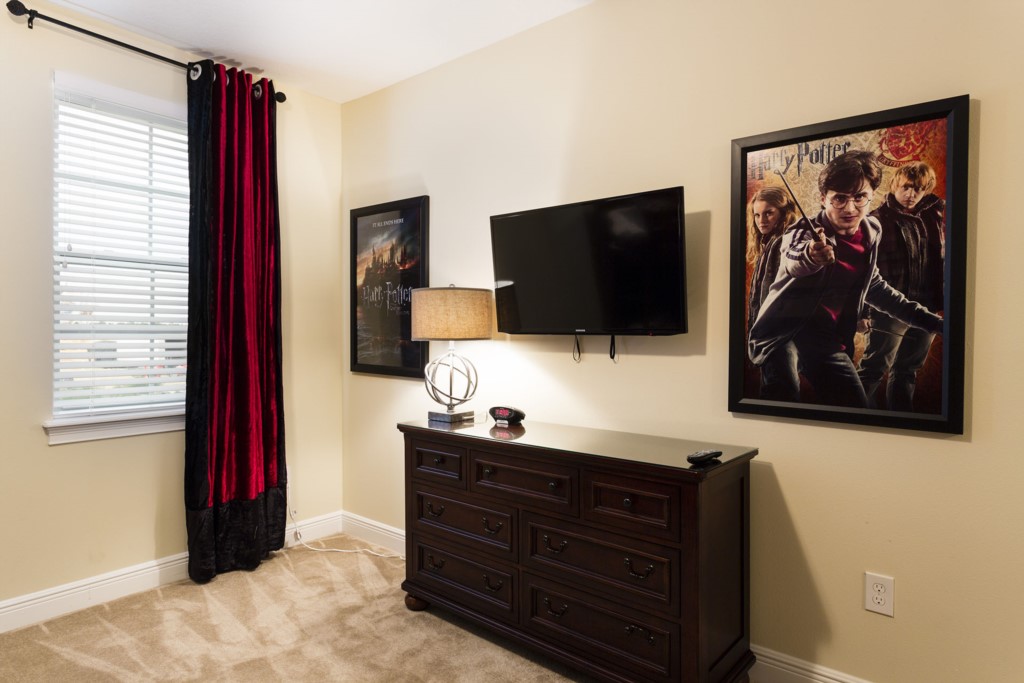 A Harry Potter themed Bunkbed Room with 2x full mattresses and Xbox - Family Bathroom nearby.