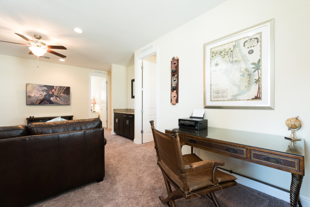 Loft area with sectional leather sofa, work desk, wireless printer/scanner and TV