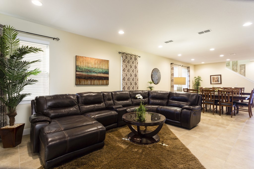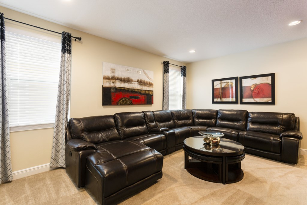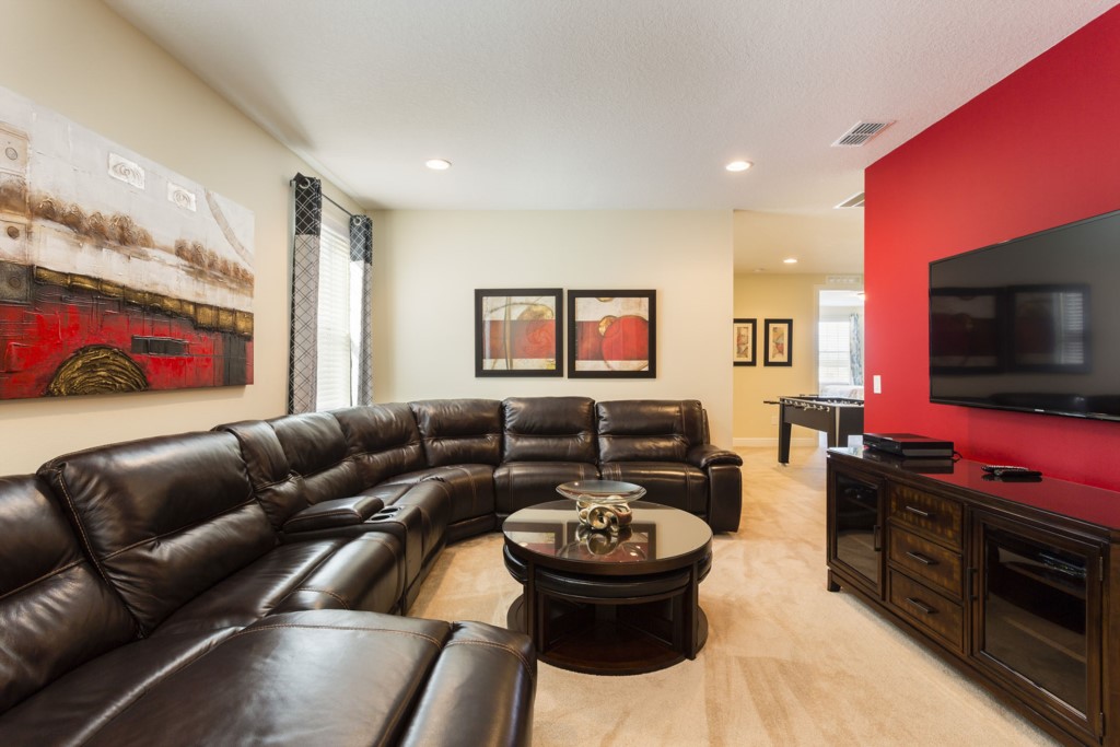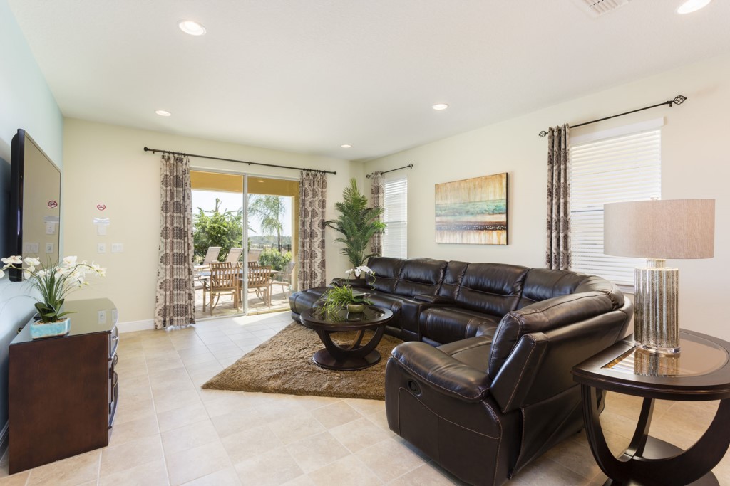 A large comfortable seating area with leather sectional recliner sofa overlooks the pool deck and includes a large flat screen TV and stylish furnishings.