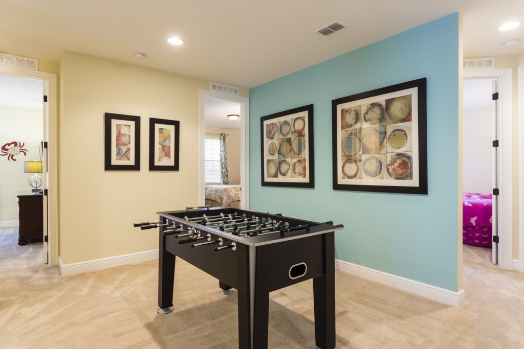 The upper floor area includes a loft with foosball table and leather sectional sofa and recliner.