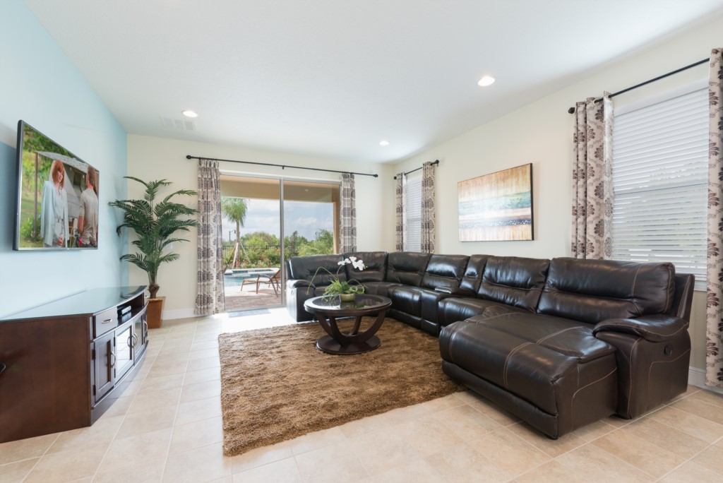 The open layout of the main family living area, includes pool deck views, comfortable seating, and a fully equipped kitchen and dining area for snacks, meals and quality family time together.