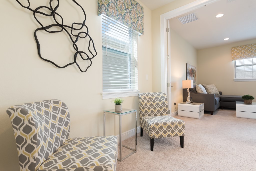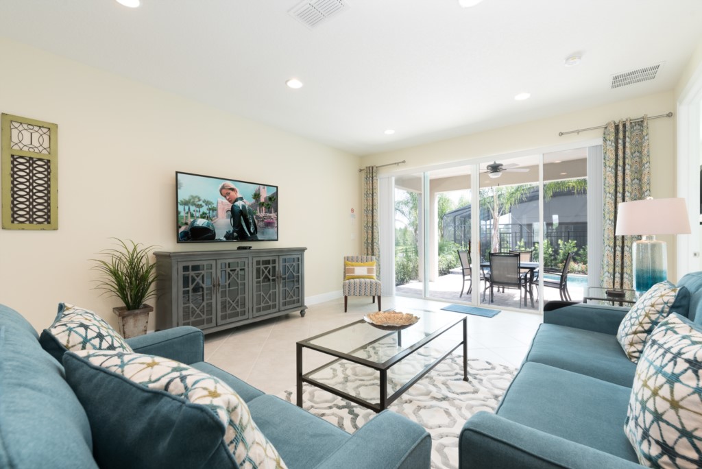 Comfortable seating area with a sofa, love seat, and accent chair overlooking the private pool deck