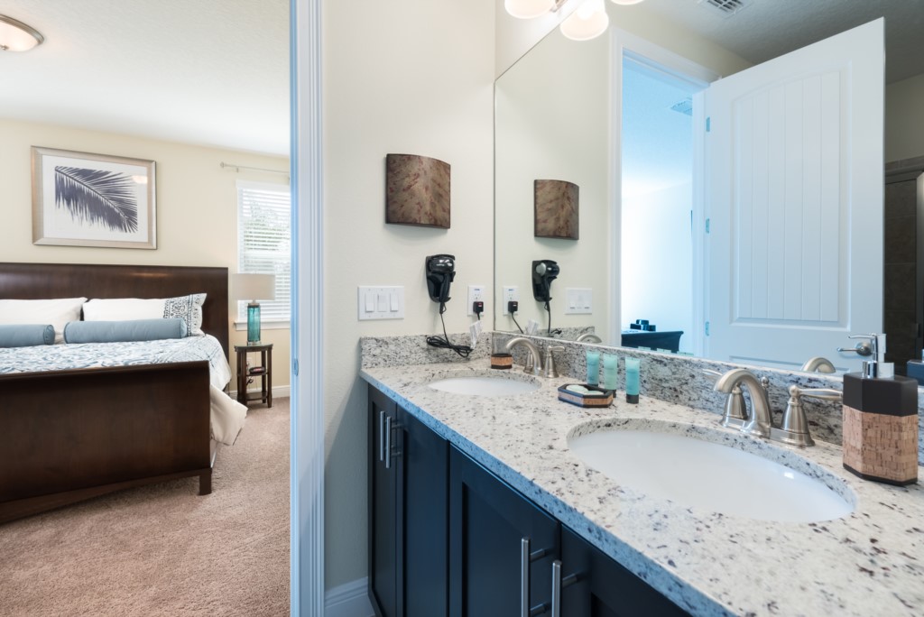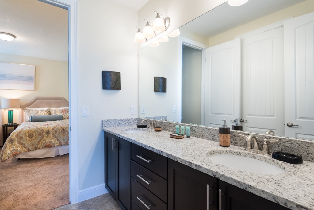 A bedroom with 2x Full sized beds and an en suite (Jack/Jill style-shower, twin vanities) connecting to a Queen sized bedroom