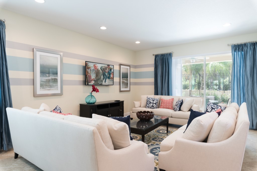 Spacious comfortable seating area with three sofas overlooking the prviate pool deck through sliding glass doors