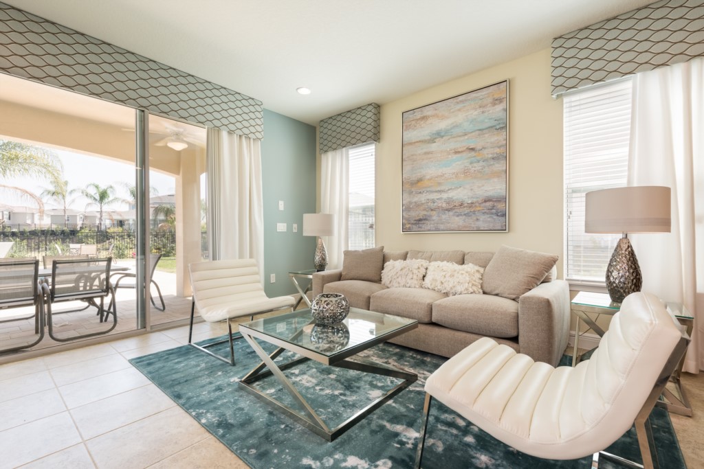 Spacious comfortable seating area with 2x sofas and 4x accent chairs overlooking the private pool deck through sliding glass doors