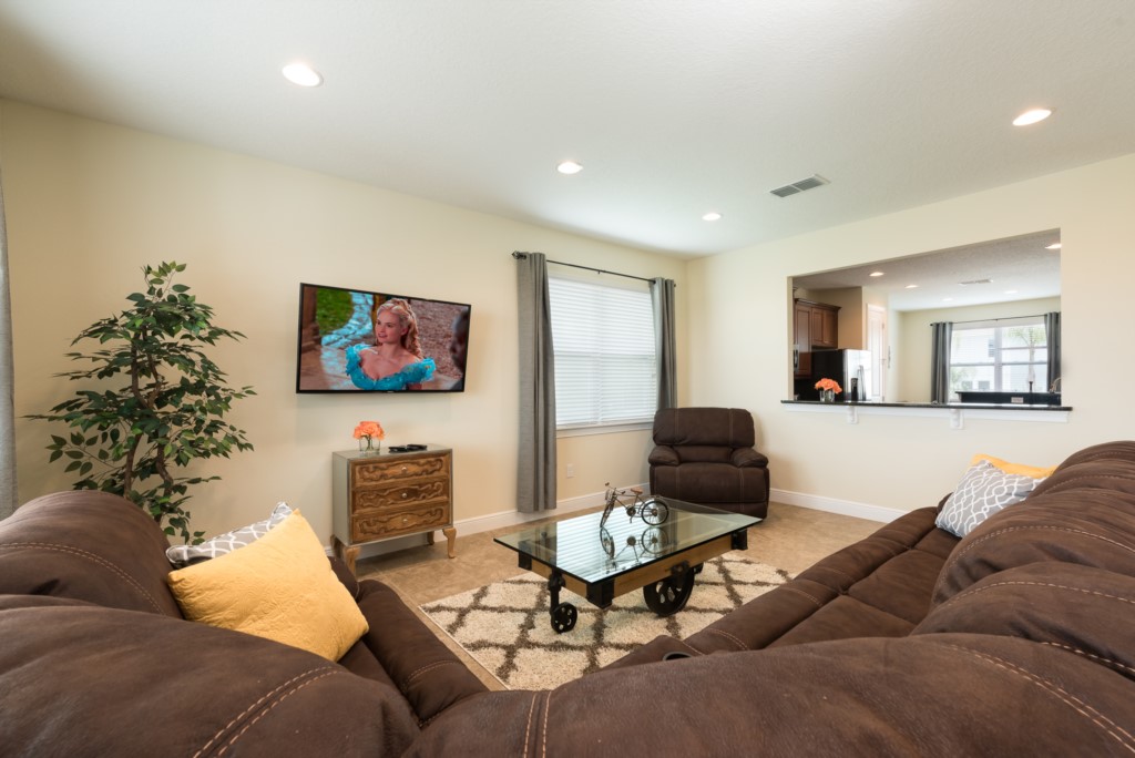 An open layout living area with sectional sofa and large SMART TV
