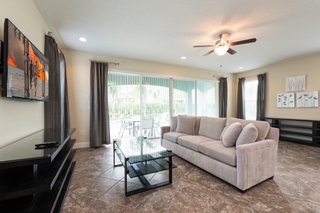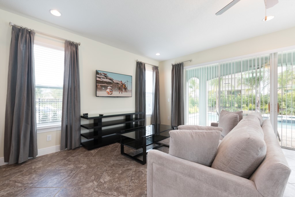 Spacious living area with a couch (seats three) and TV overlooking the private pool deck