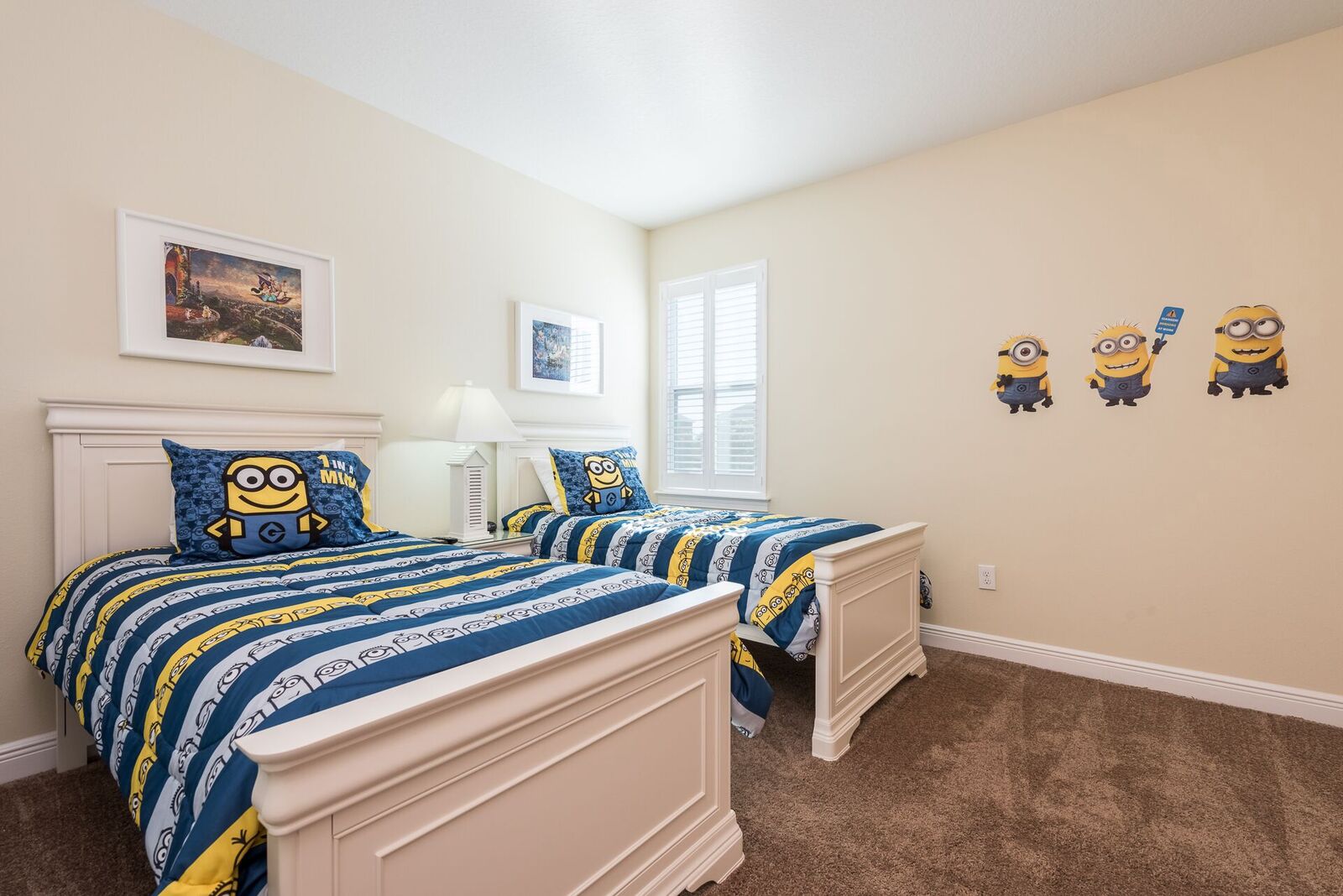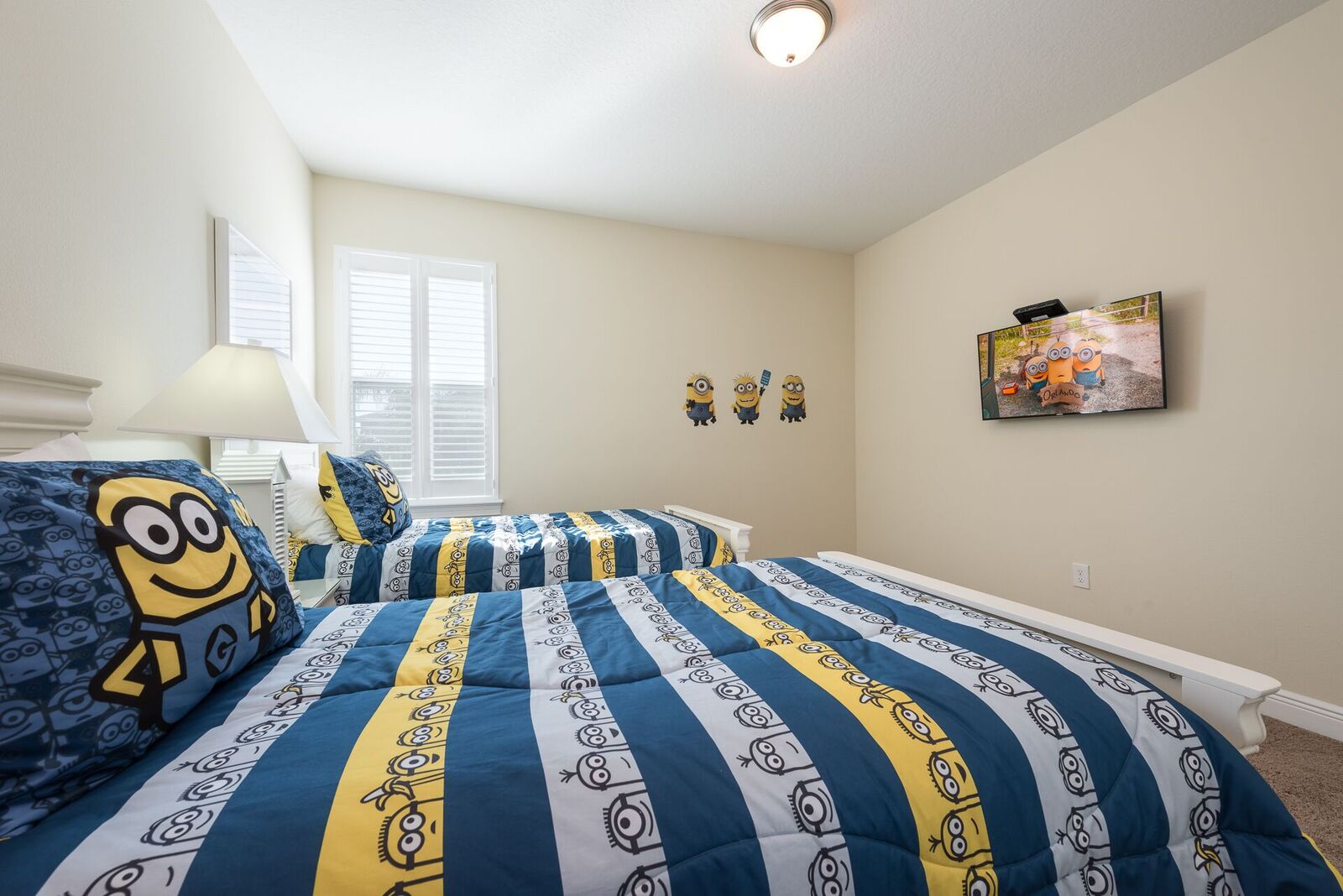 'Minions' themed bedroom with a Full and a Twin sized bed