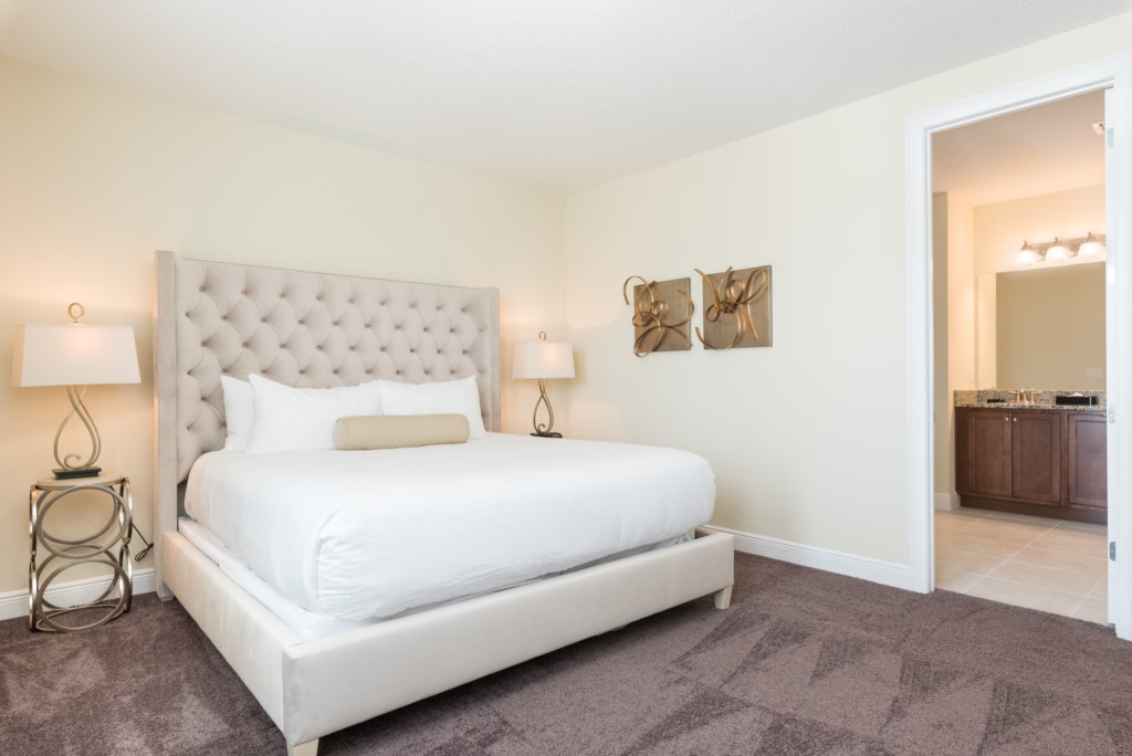 King sized bedroom with twin vanites and shower