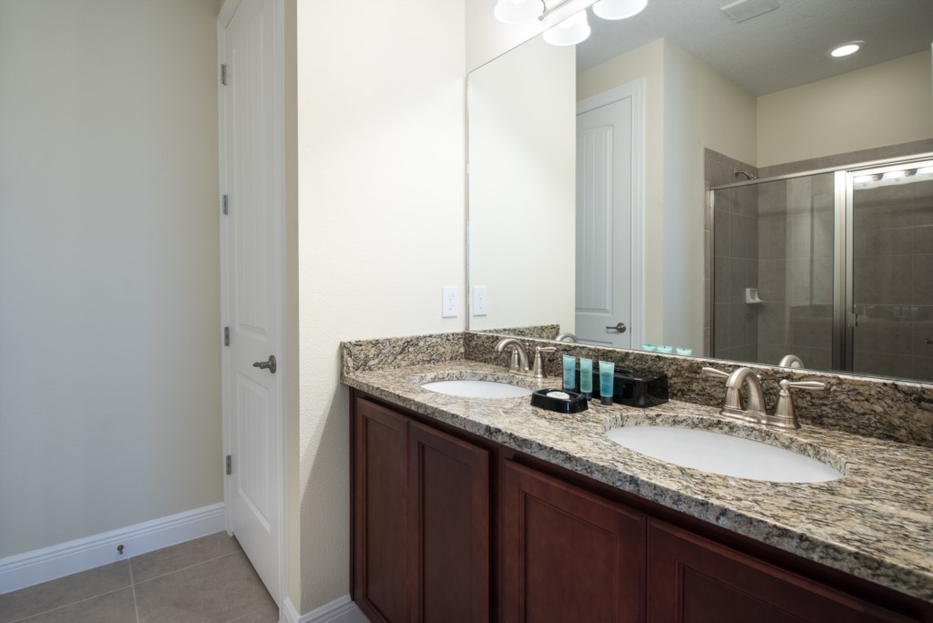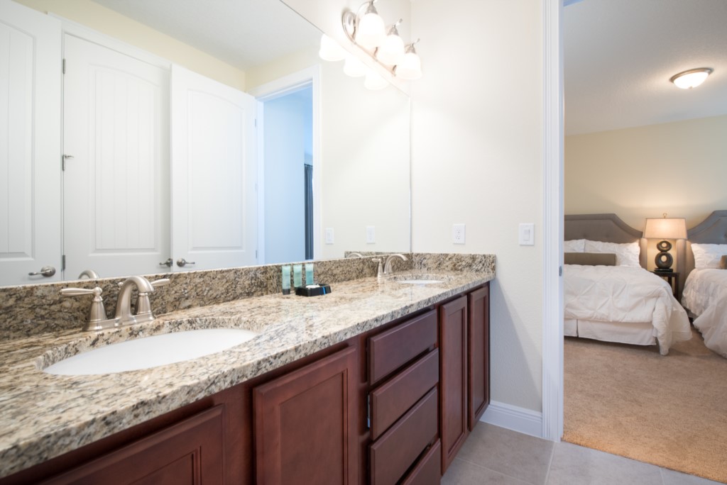 A room with a Full and twin bed shares a Jack Jill stlye bathroom (shower and twin vanities)
