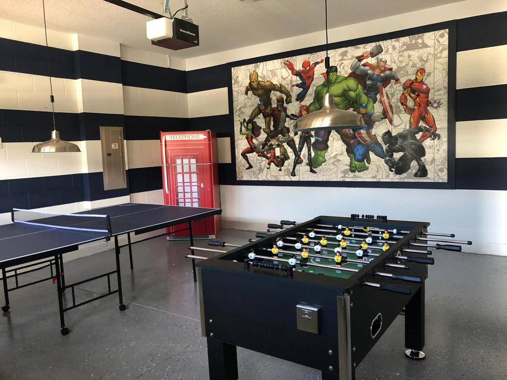 Games room has a ping pong and foosball table