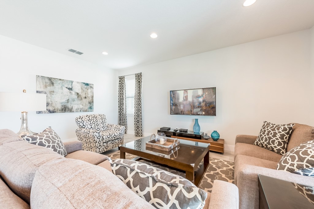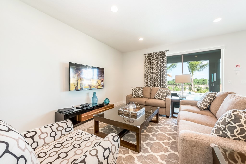 Spacious comfortable seating area with a sofa, love seat, and an accent chair overlooking the private pool deck through sliding glass doors