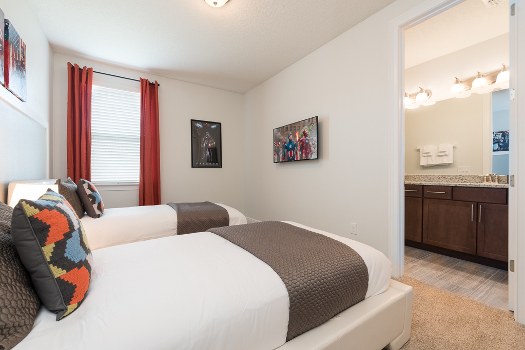 Bedroom with 2x Twin sized beds and an en suite (shower, twin vanities)