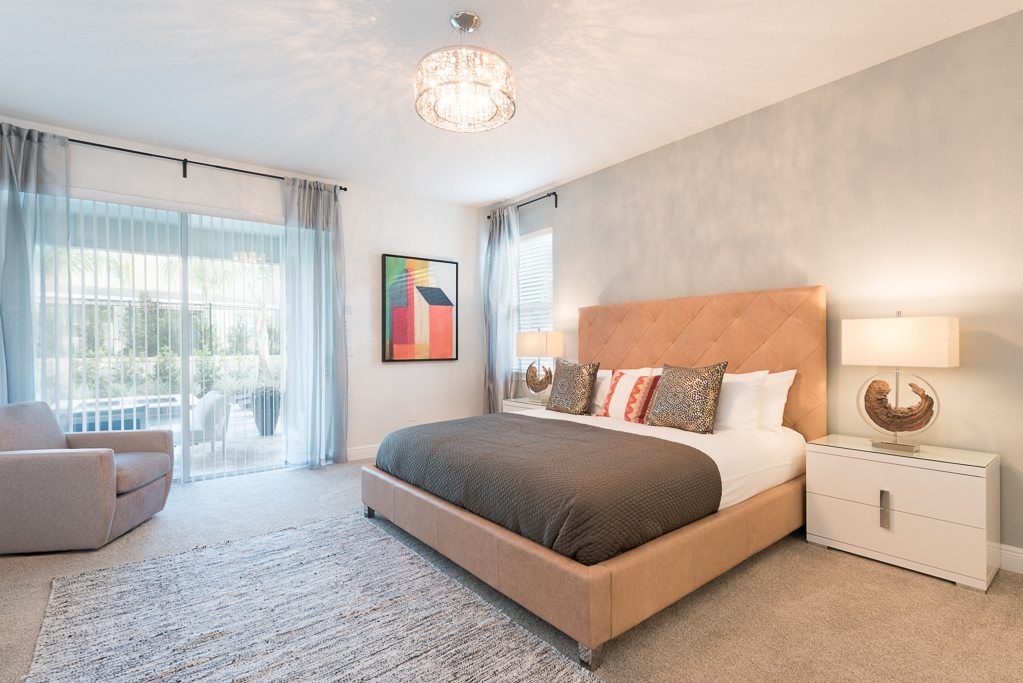 King sized master with en suite (shower, tub, twin vanities), an accent chair, and patio access