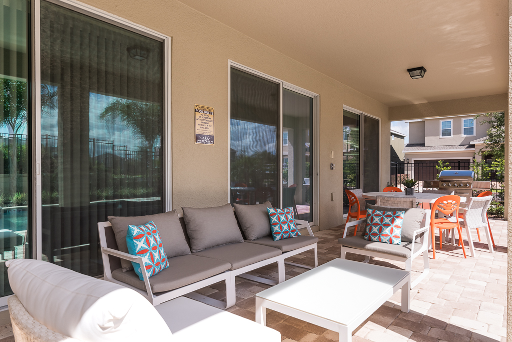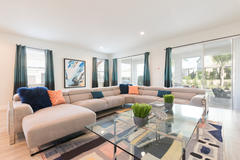 Spacious comfortable seating area with a large sectional overlooking the private pool deck through sliding glass doors