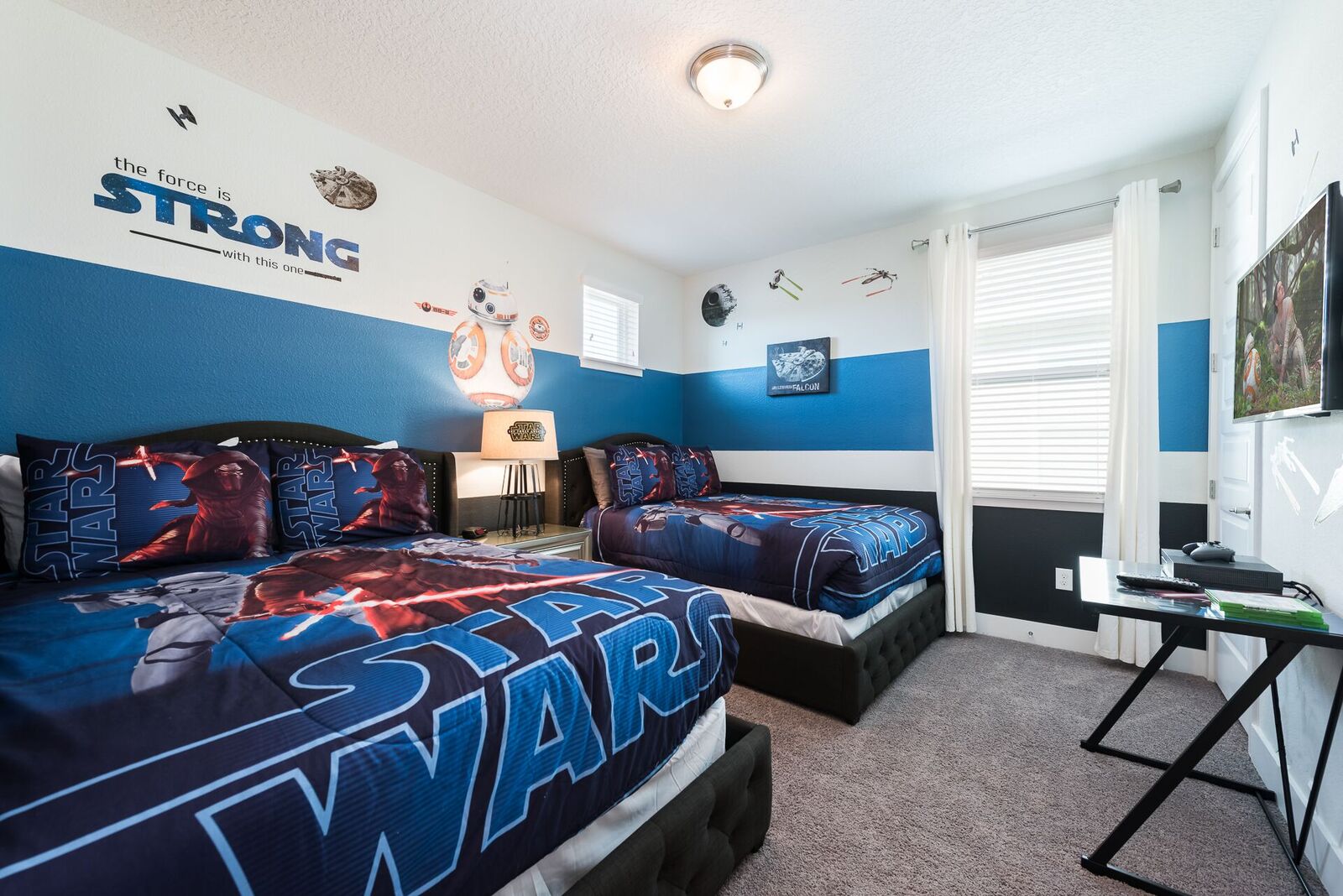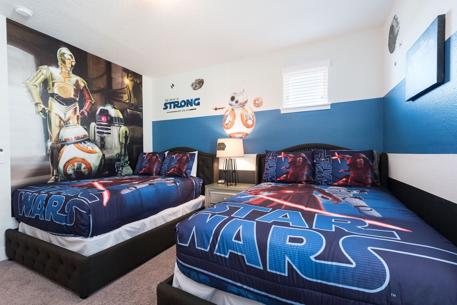 Star Wars themed bedroom with 2x Full sized beds and an en suite (shower)