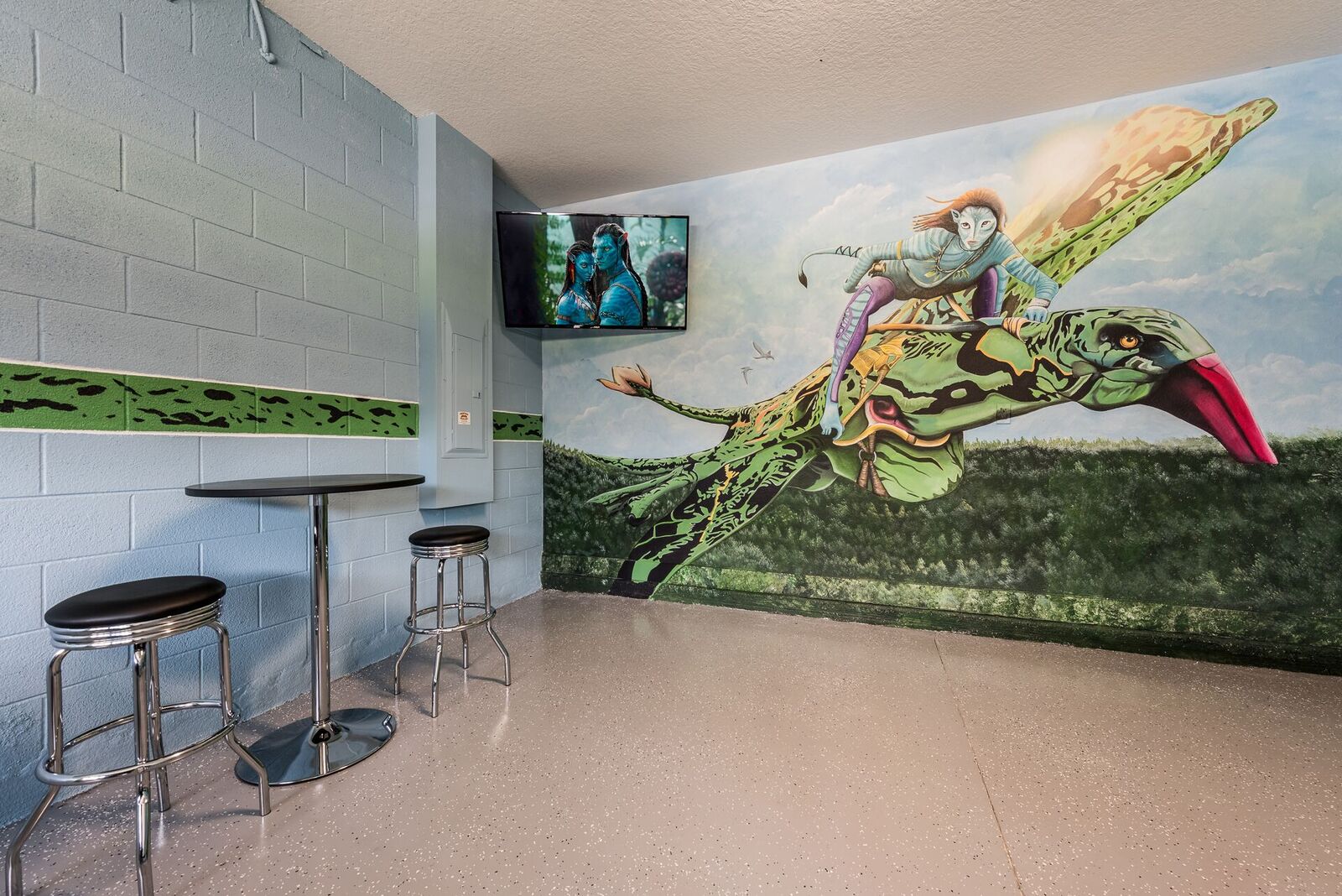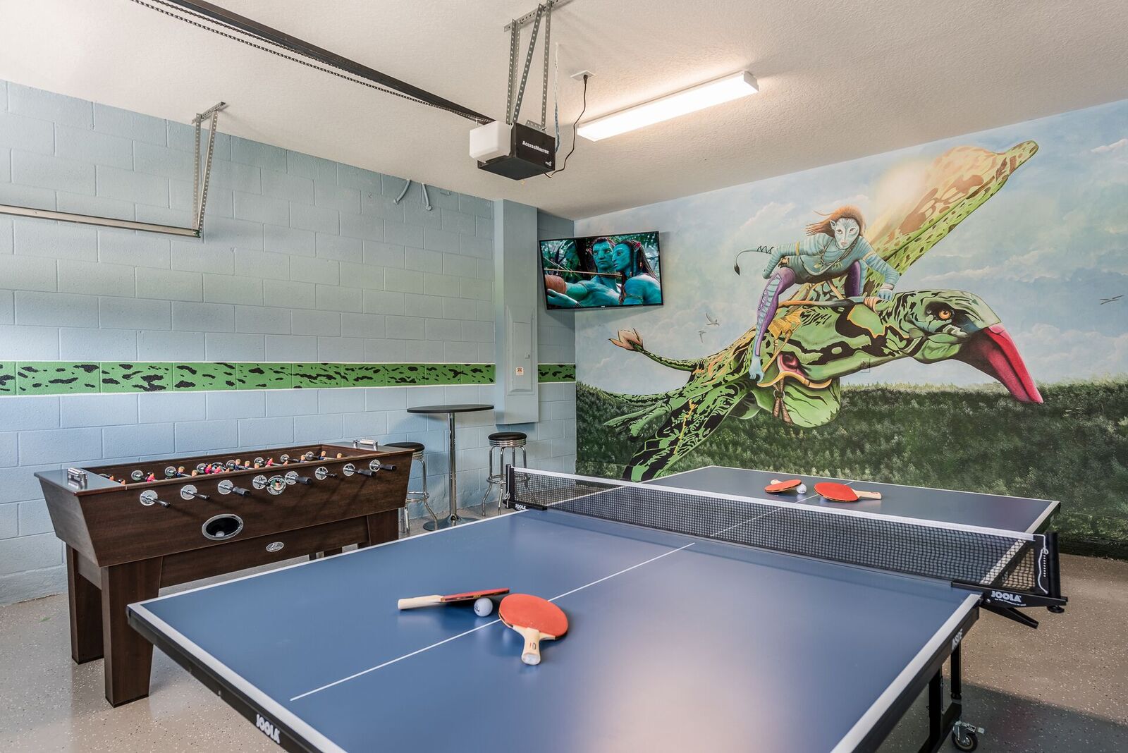 'Avatar' themed games room has a foosball and ping pong table, large flat screen TV, 2 seat high top table