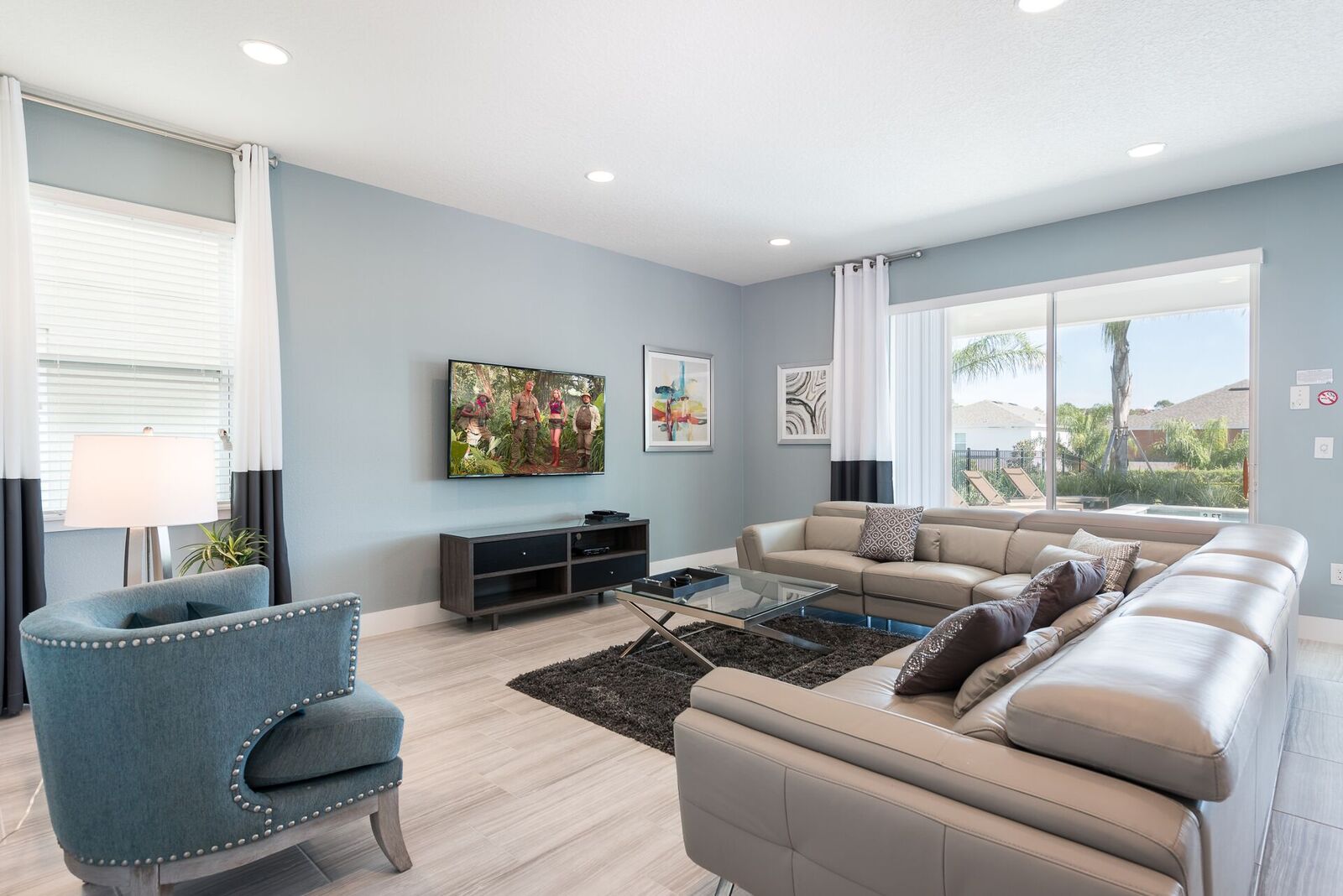 Spacious comfortable seating area with a large leather sectional and accent chair overlooking the private pool deck through sliding glass doors