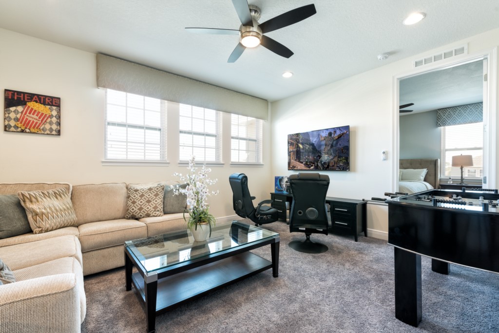 Upstairs loft living space has a large flat screen TV, a sectional, two gaming chairs, Sony Playstation 4, and a foosball table