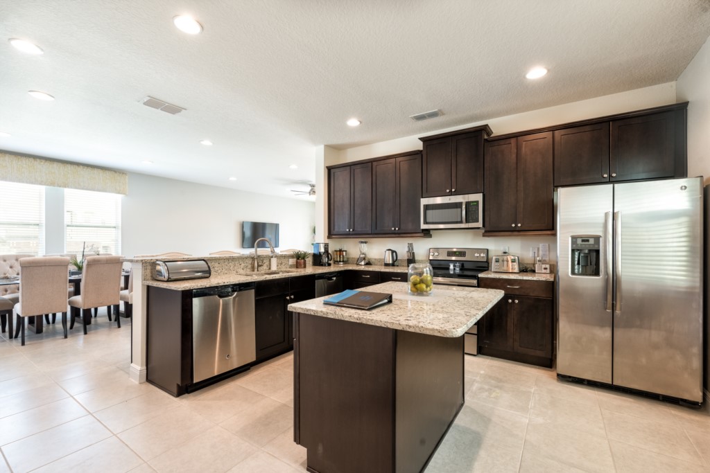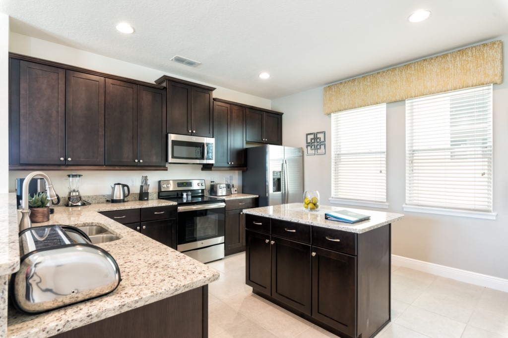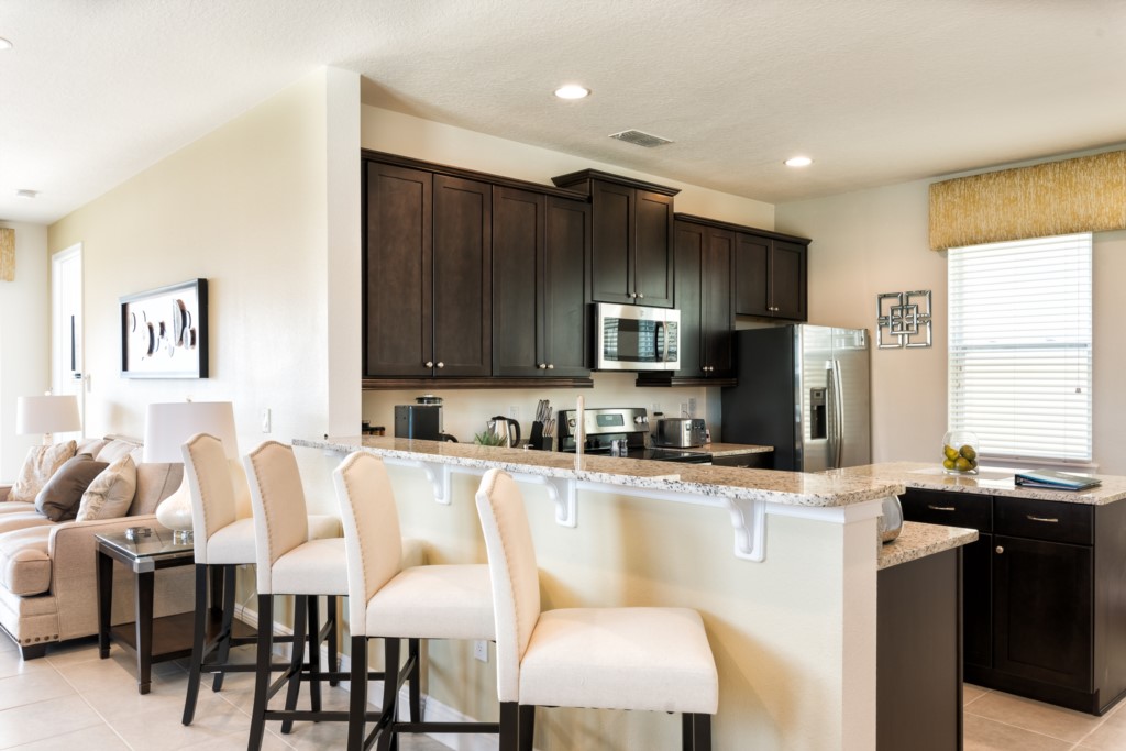 Fully equipped with upgraded granite countertops and a four seat breakfast bar as well as an island
