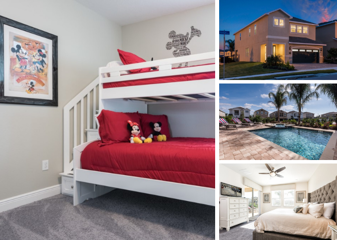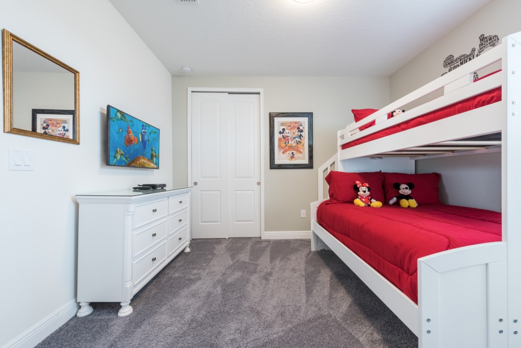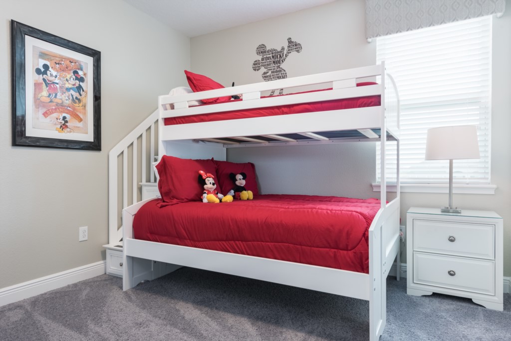 'Mickey Mouse' themed bedroom with bunk beds (a Twin and a Full sized bed) and an en suite (shower/bath combo)