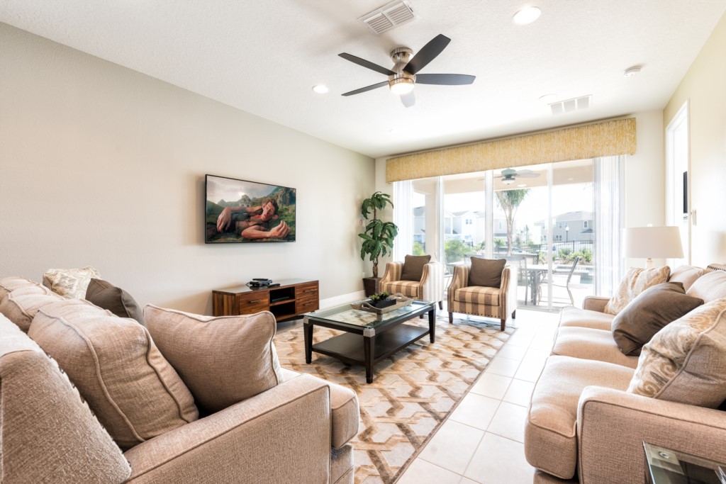Spacious comfortable seating area with two sofas and two accent chairs overlooking the private pool deck through sliding glass doors