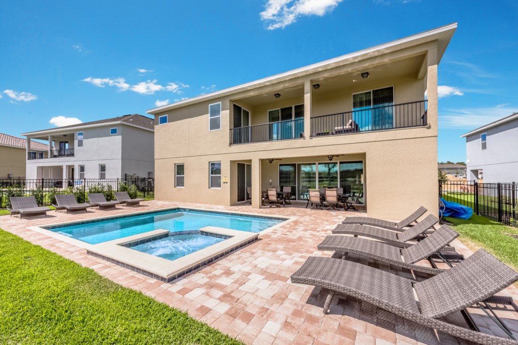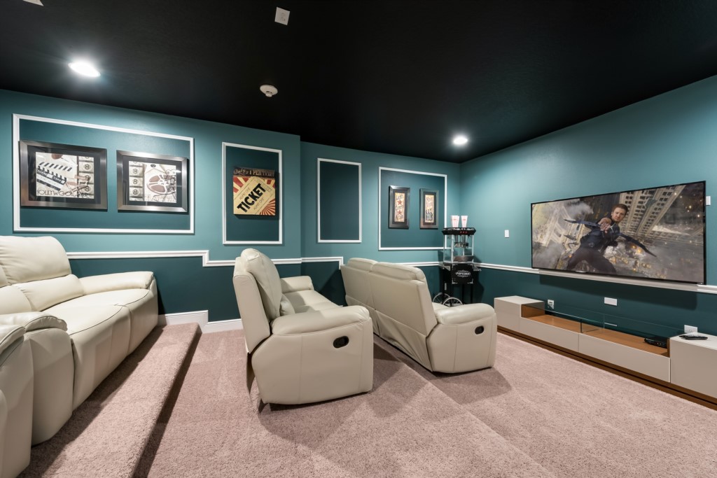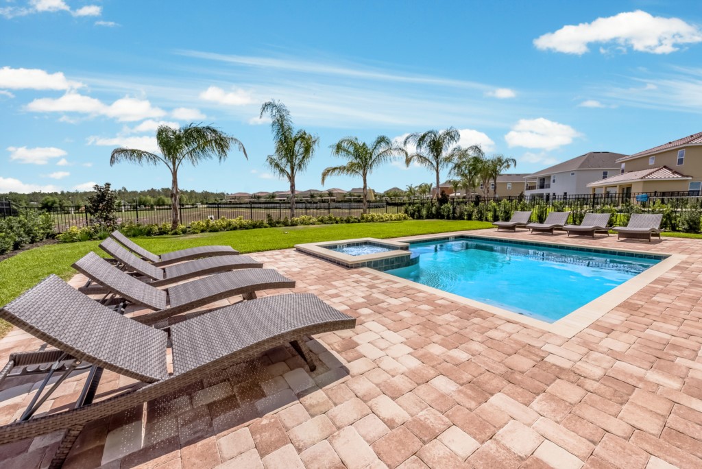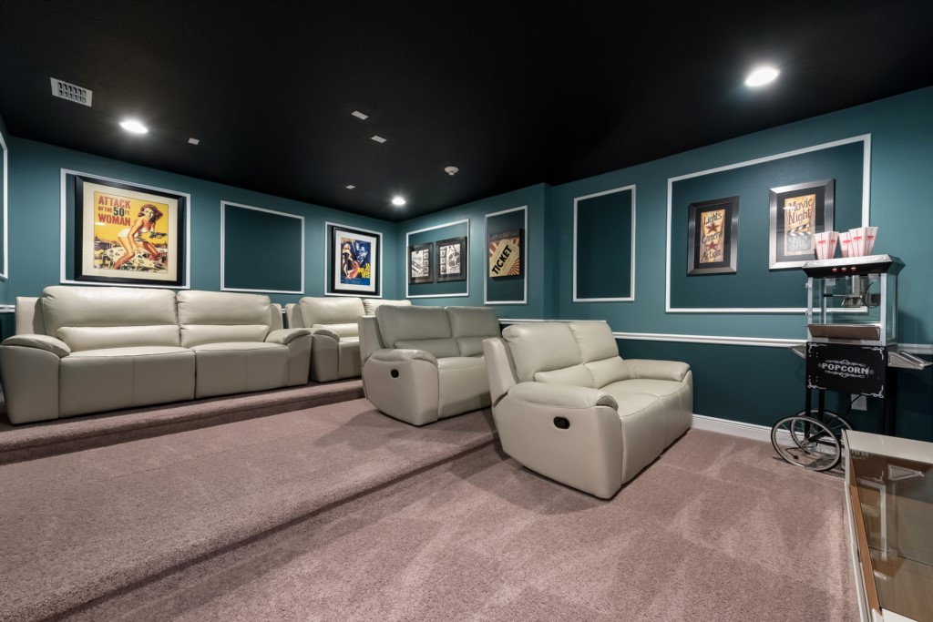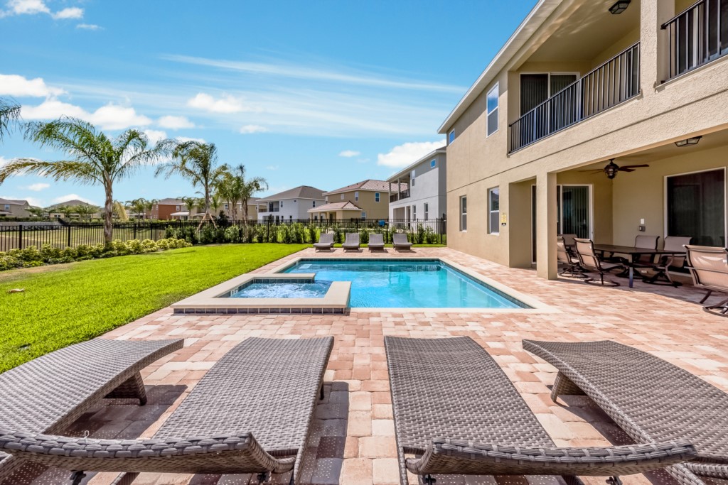 The private patio with a swimming pool and spillover spa is the perfect way to enjoy Florida's sunshine and the home theater is the only way to relax after long days at the theme parks where you and your loved ones can watch your favorite movies together!