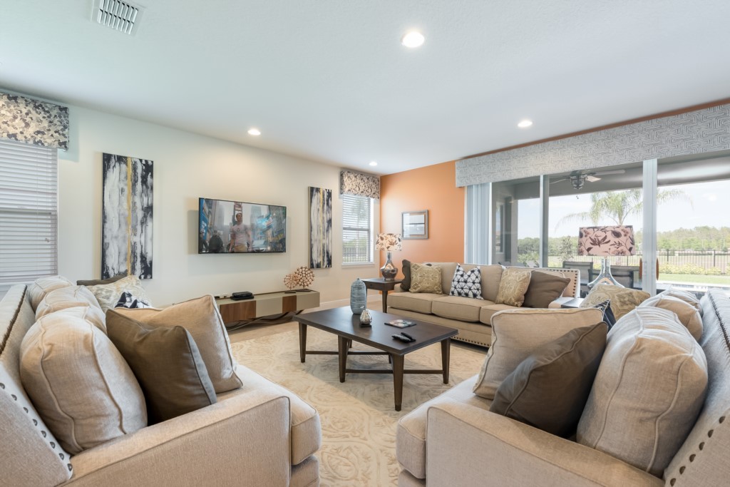 Spacious comfortable seating area with 3x sofas overlooking the private pool deck through sliding glass doors