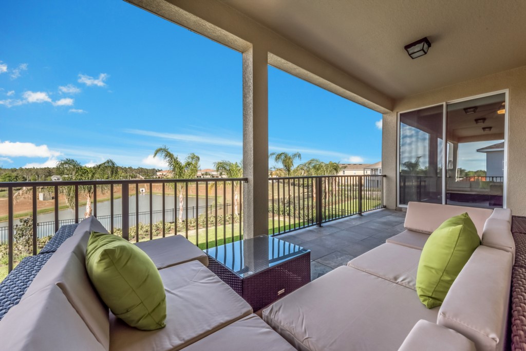 Upstairs balcony is furnished with a comfortable outdoor sectional