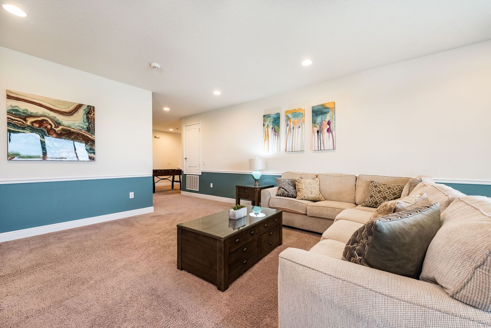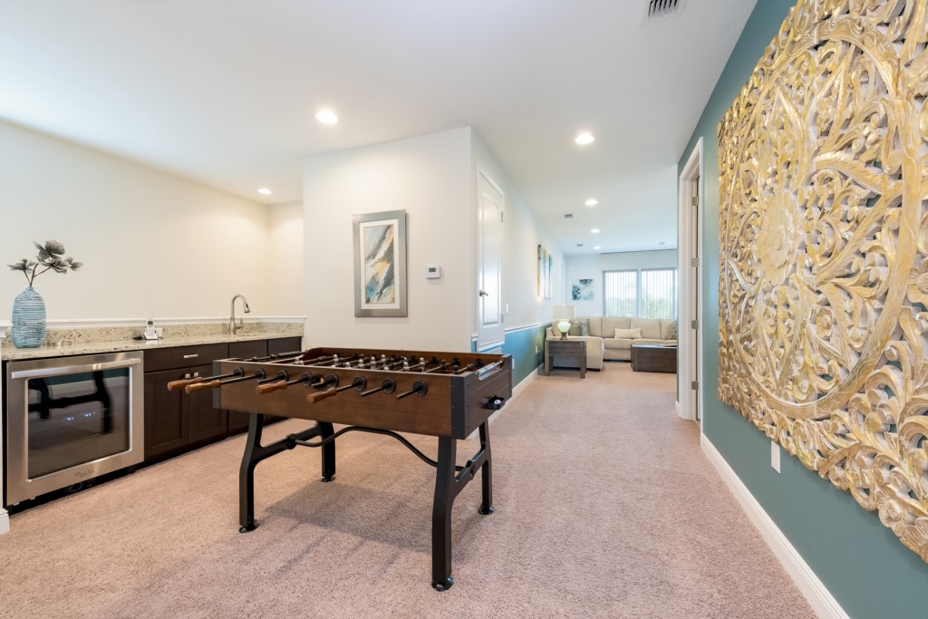 Upstairs entertainment loft area has a large flat screen TV, sectional, wet bar, foosball table