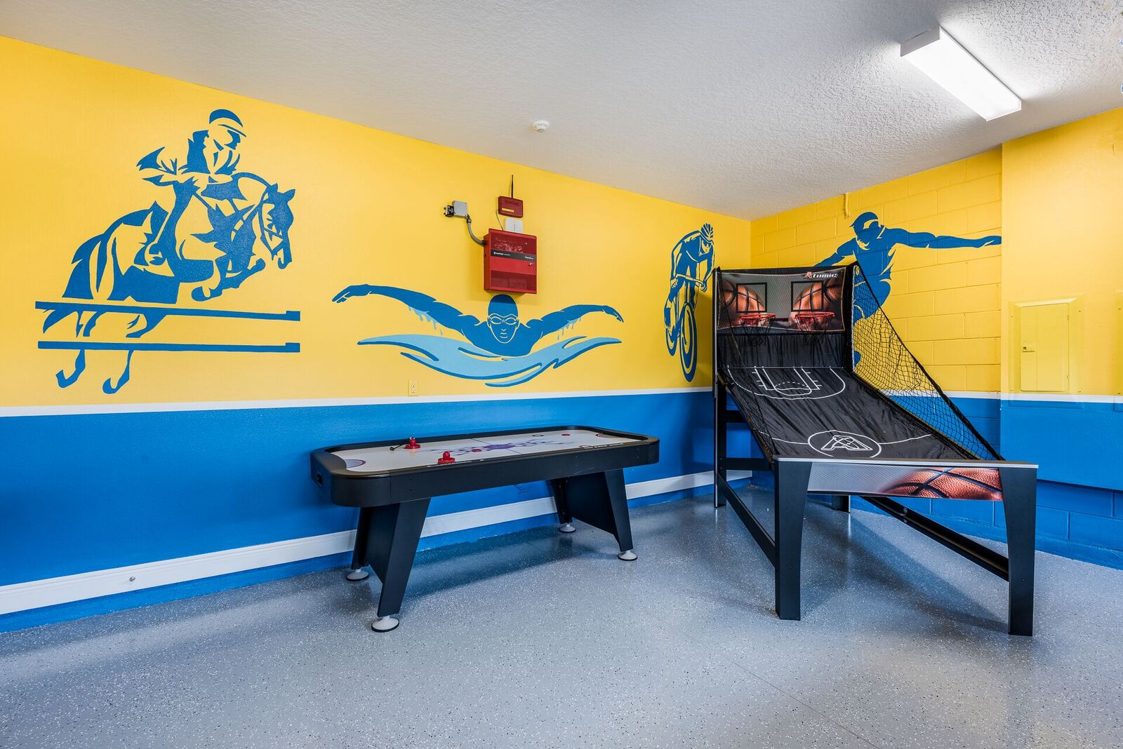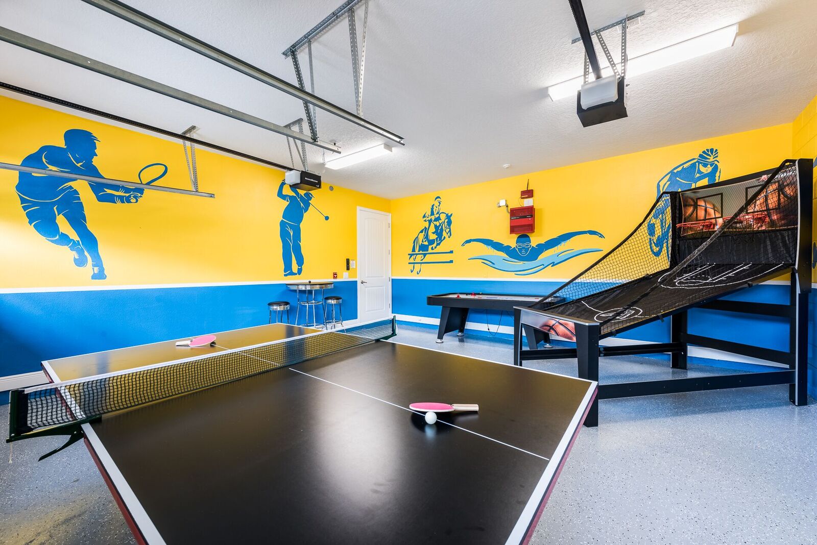 Games room has a ping pong and air hockey table, basketball shooting game, and 2 seat high top table