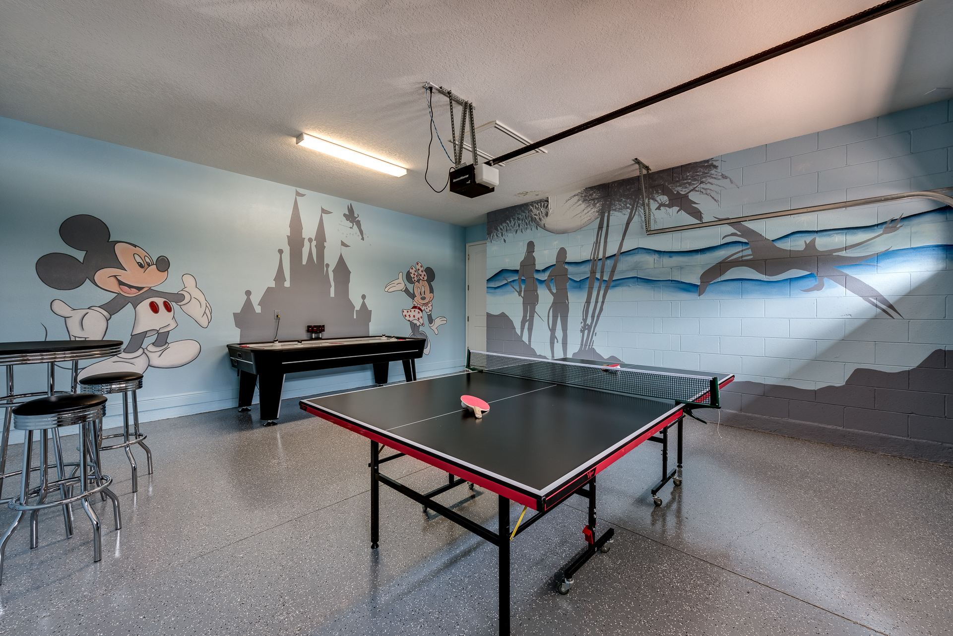 Themed games room has an air hockey and ping pong table as well as a 2 seat high top table