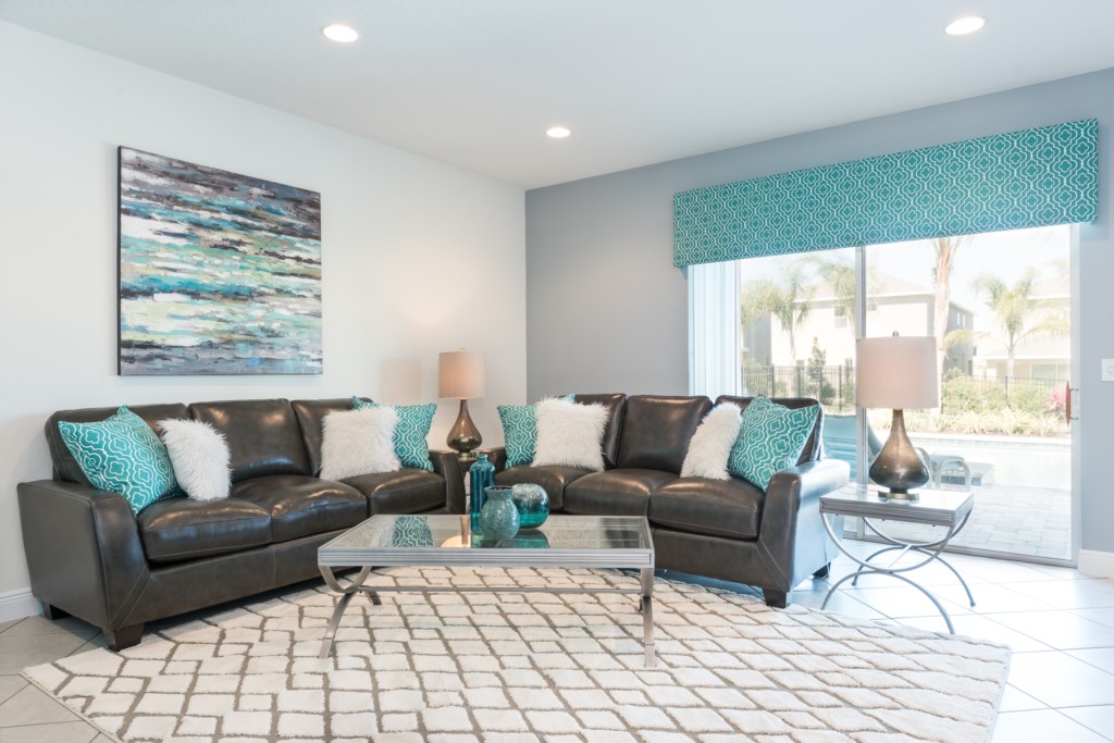 Spacious comfortable seating area with 2x leather sofas overlooking the private pool deck through sliding glass doors