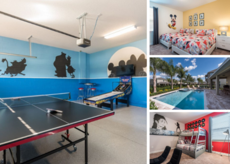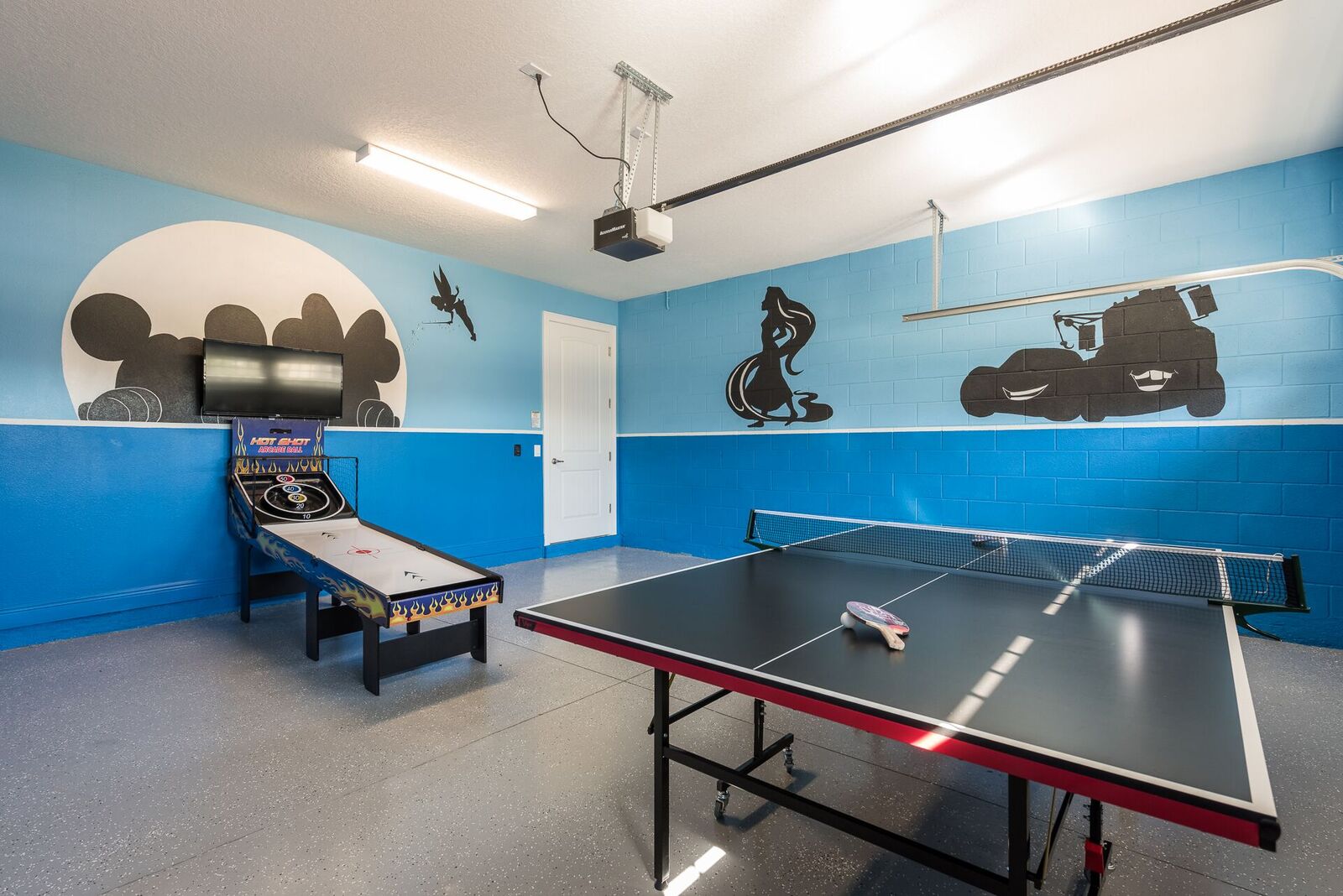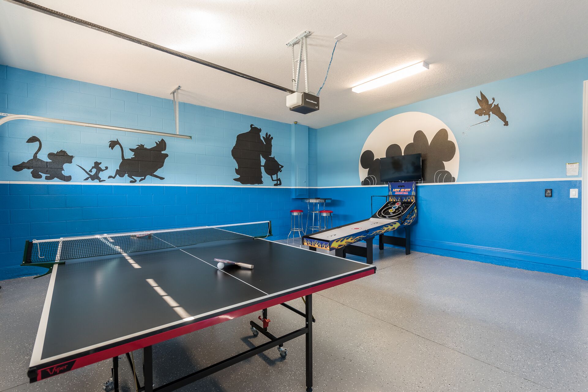 'Disney' themed games room has skeeball, ping pong table, and a flat screen TV