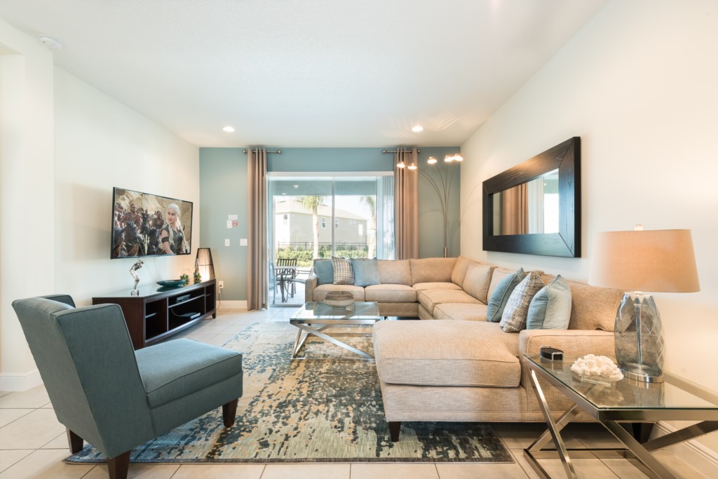 Spacious comfortable seating area with a large sectional and accent chair overlooking the private pool deck through sliding glass doors
