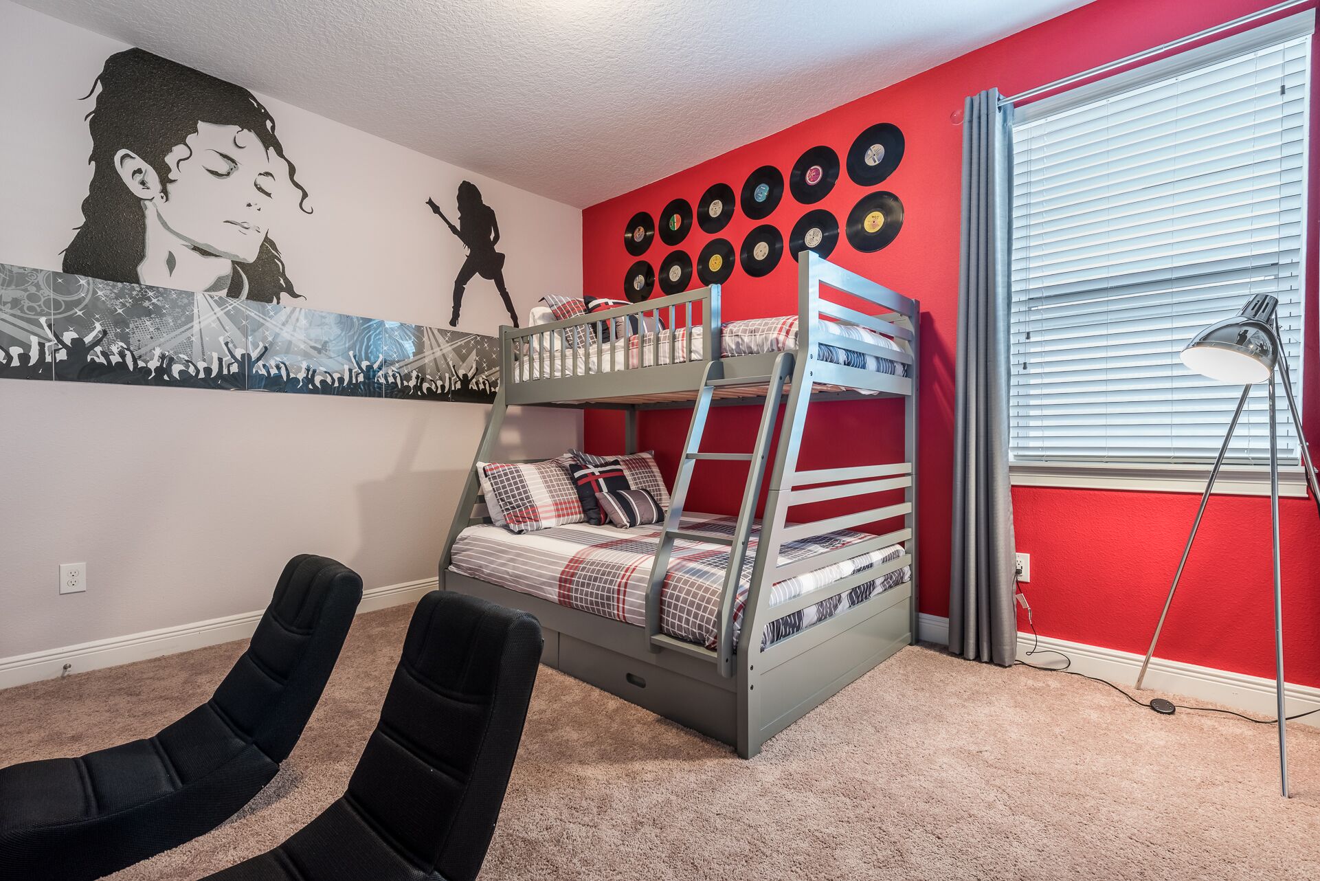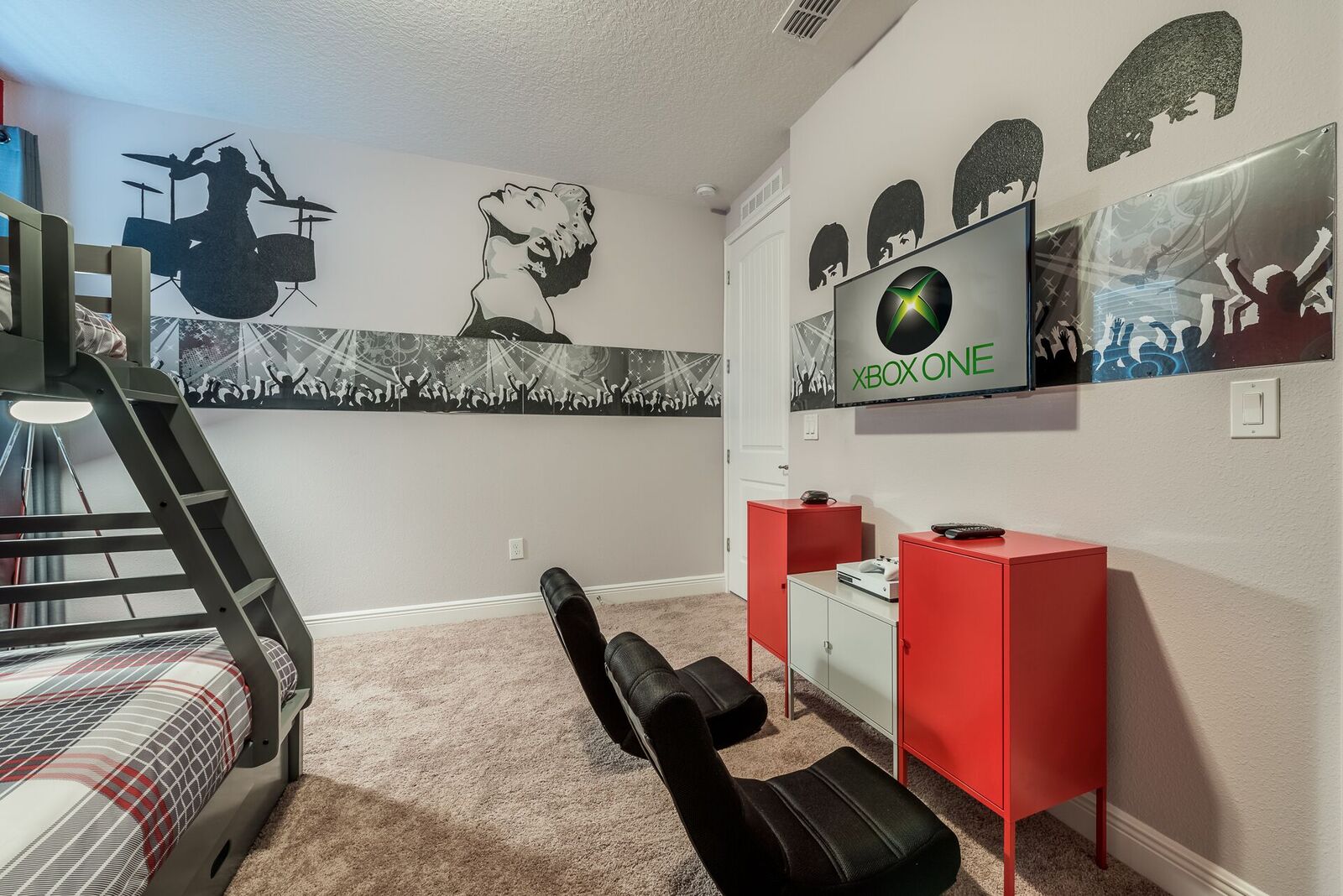 Music themed bedroom with bunk beds (a Twin and a Full sized bed), an en suite (shower, twin vanities), two gaming chairs, and an x-box game console