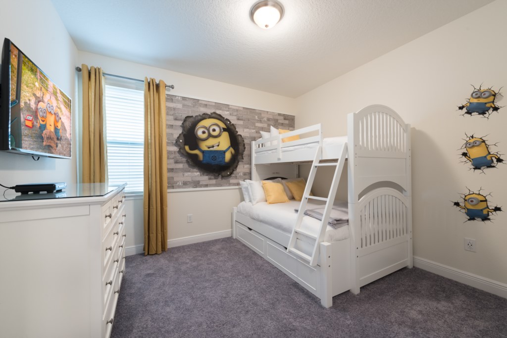 'Minions' themed bedroom with bunk beds (Twin and Full sized bed) and an en suite (shower)