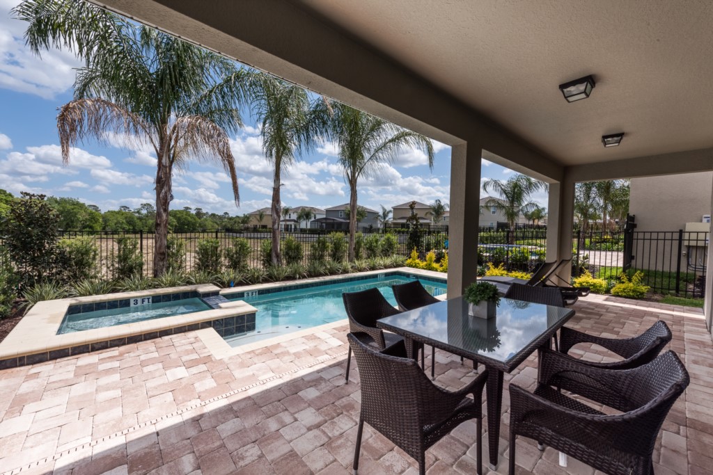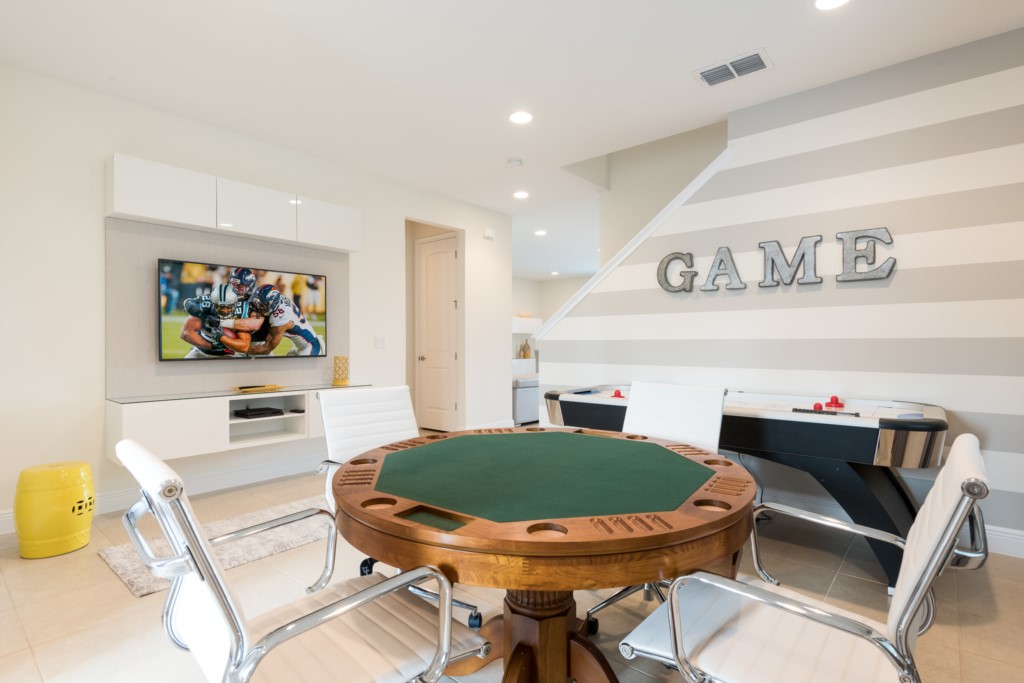 The private swimming pool and spa is the perfect way to experience Florida's warm weather and the foyer offers hours of entertainment with a PS4 video game console, an air hockey table, and a card table!