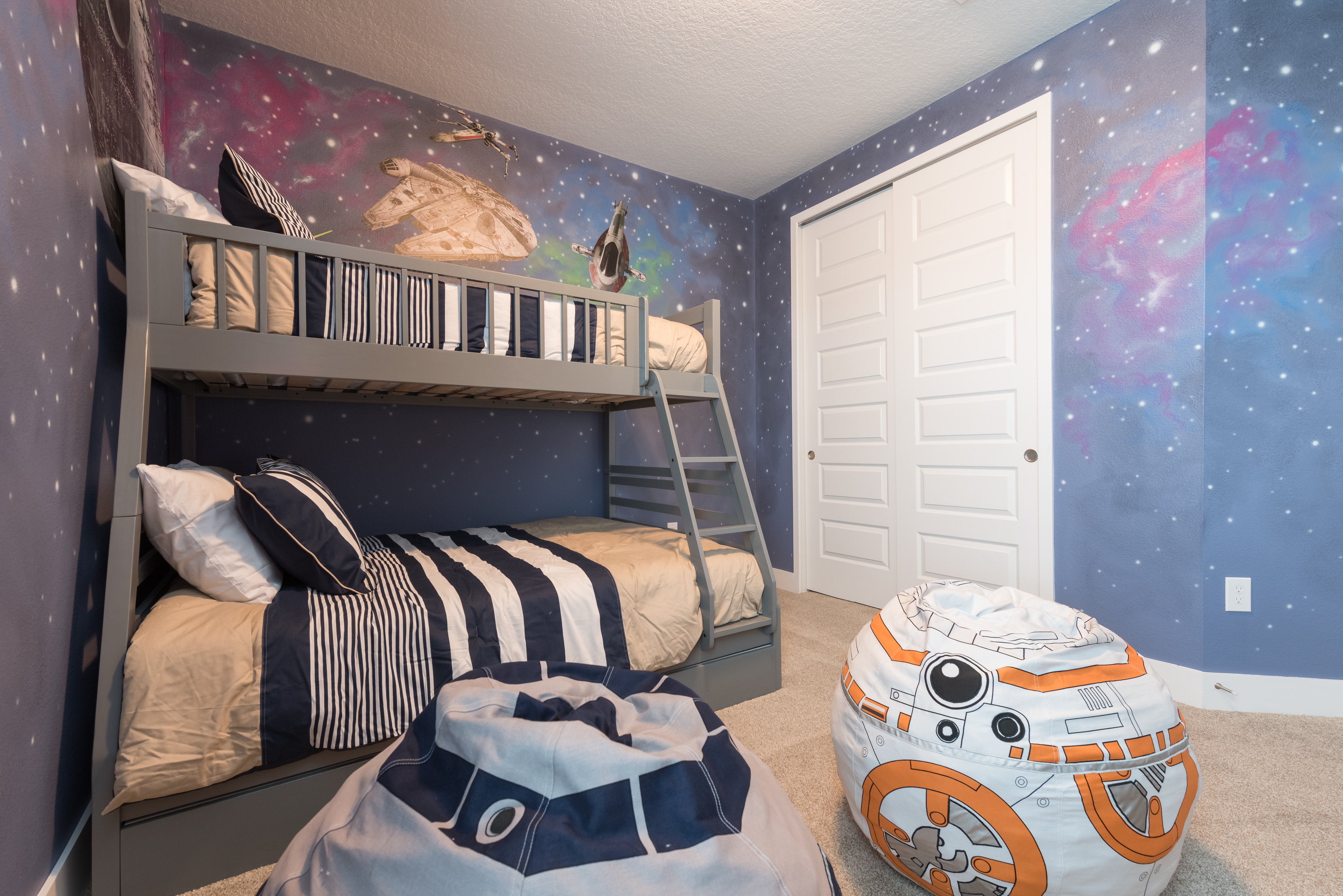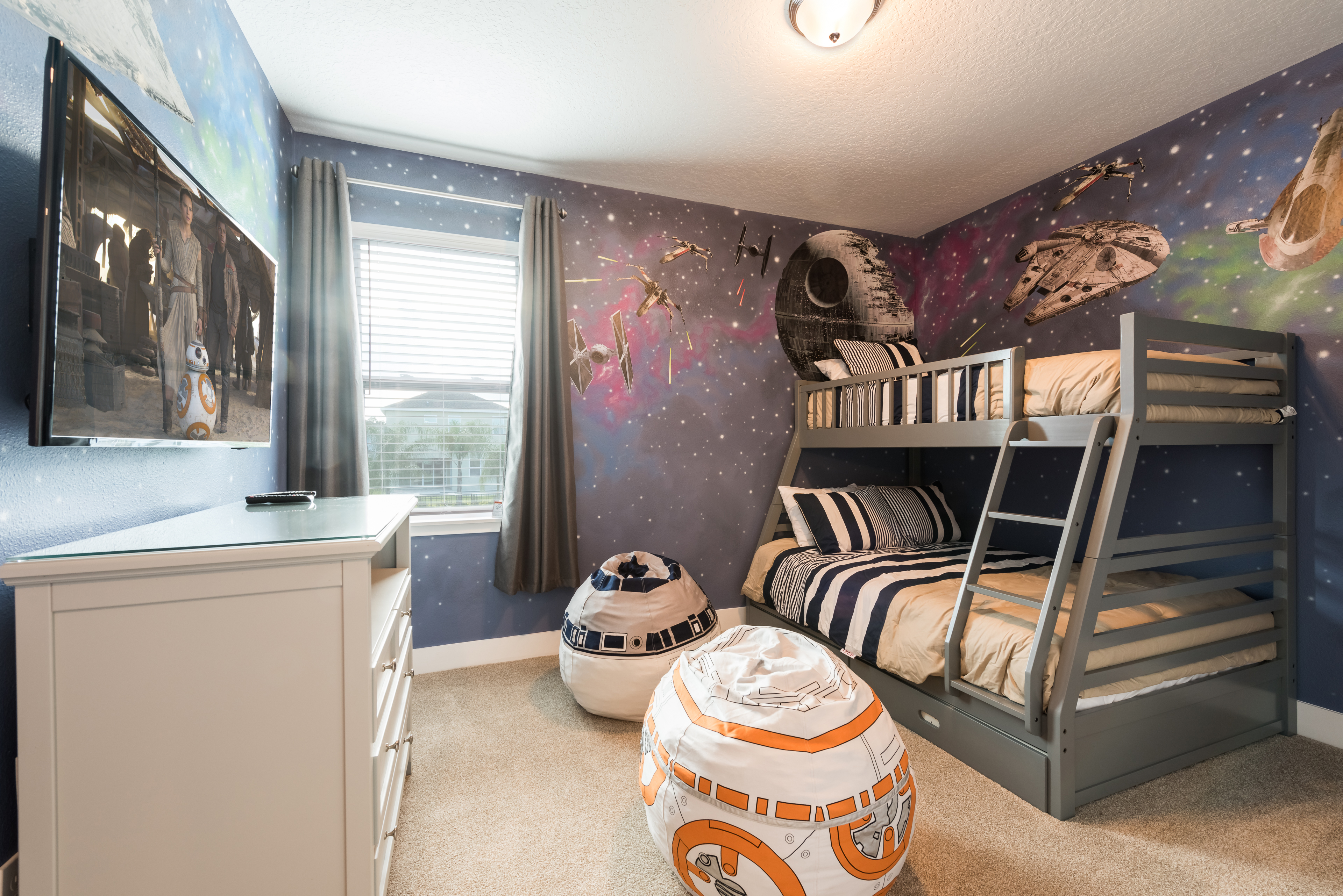 'Star Wars' themed bedroom with bunk beds (Twin and Full sized beds), 2x bean bag chairs, and an X-Box video game console